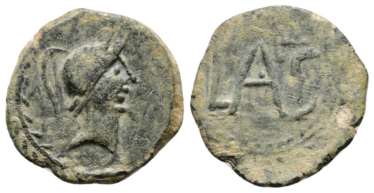 LASTIGI. Cuadrante. 150-50 a.C. Aznalcóllar (Sevilla). A/ Cabeza masculina con casco a derecha, dentro de láurea. R/ LAS entre líneas, dentro de láurea. FAB-1680. Ae. 2,34g. MBC-/MBC.
