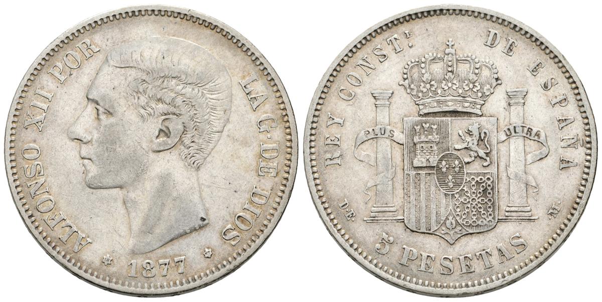 ALFONSO XII. 5 Pesetas. 1877 *18-77. Madrid DEM. Cal-28. Ar. 24,87g. Golpecito en el canto y marquitas. MBC.