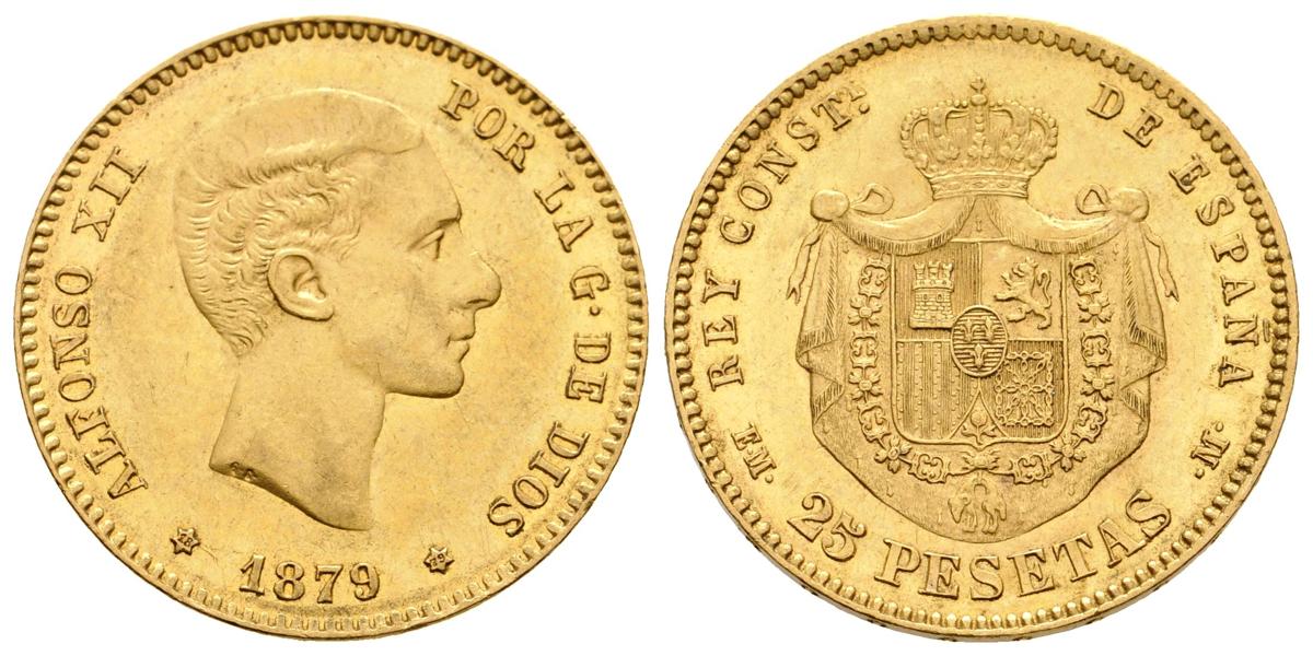 ALFONSO XII. 25 Pesetas. 1879 *18-79. Madrid EMM. Cal-9. Au. 8,06g. Hojita en anverso. EBC.