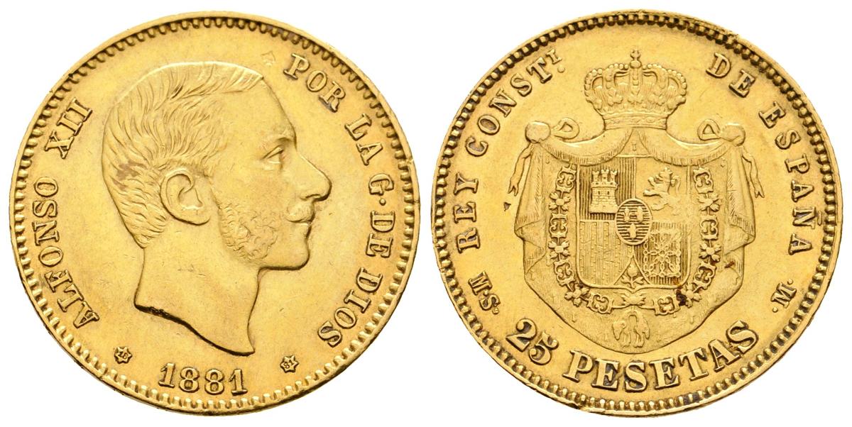 ALFONSO XII. 25 Pesetas. 1881 *18-81. Madrid MSM. Cal-14. Au. 8,04g. Hojita en anverso. MBC+.