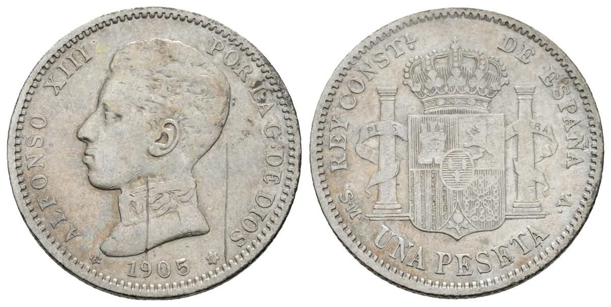 ALFONSO XIII. 1 Peseta. 1905 *19-05. Madrid SMV. Cal-51. Ar. 4,85g. Rayas en anverso. MBC/BC+. Rara.