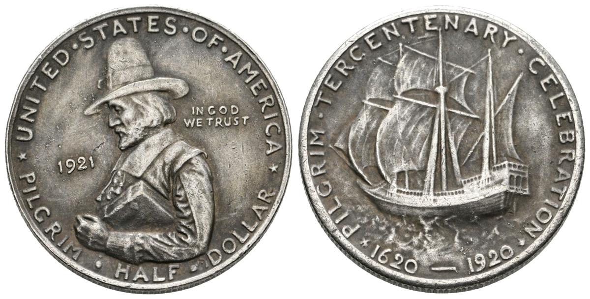ESTADOS UNIDOS. ½ Dollar. 1921. Pilgrim. Celebración del Tricentenario 1620-1920. KM#147.2. Ar. 14,76g. MBC.