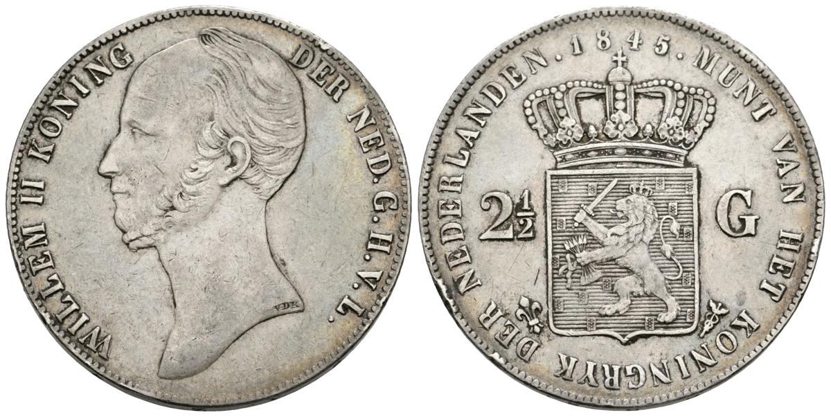 PAISES BAJOS. Willem II. 2½ Gulden. 1845. Km#69. Ar. 24,89g. Golpecitos en el canto. MBC.