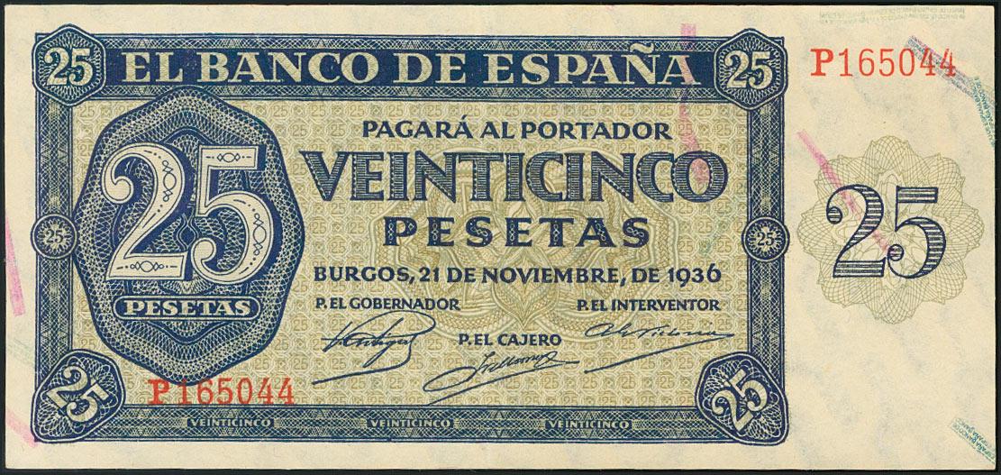 25 pesetas. 21 de Noviembre de 1936. Banco de España, Burgos. Serie P. (Edifil 2017: 419a). EBC+.