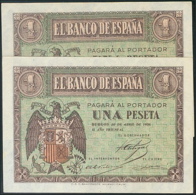 1 peseta. 30 de Abril de 1938. Banco de España, Burgos. Serie F, pareja correlativa. (Edifil 2017: 428a). SC.