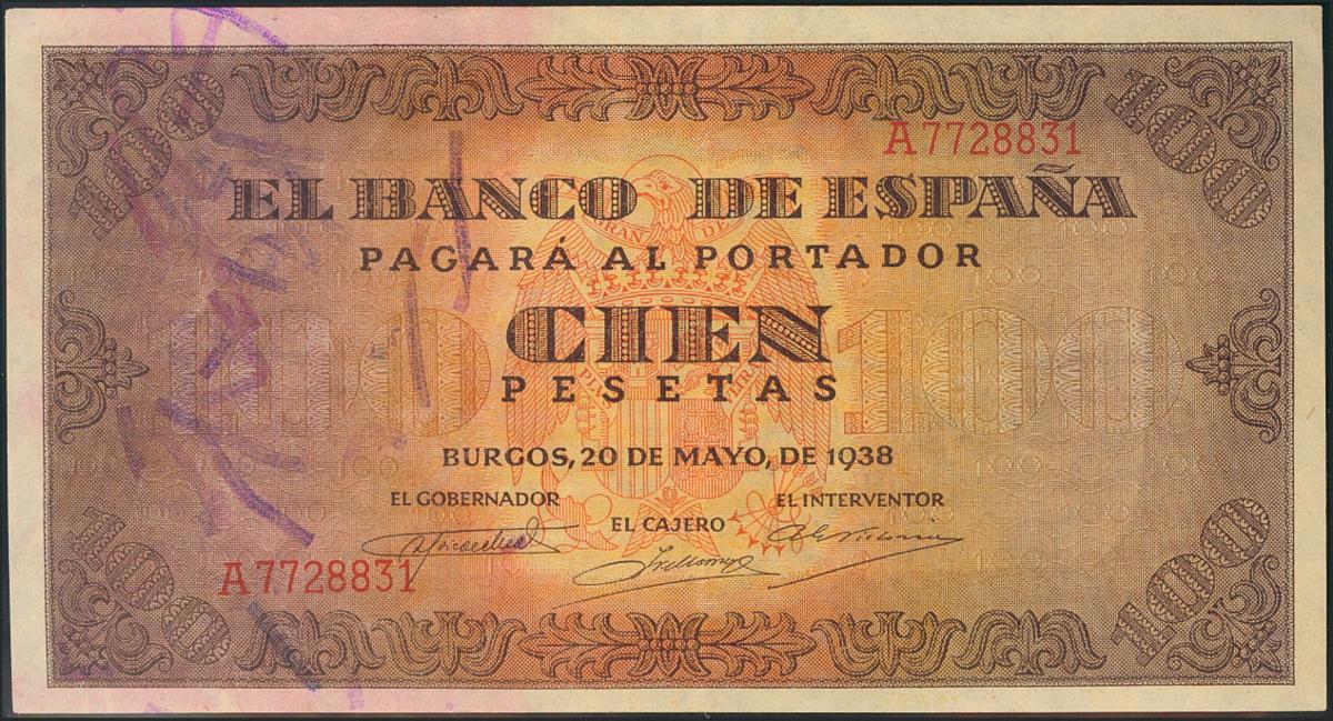 100 pesetas. 20 de Mayo de 1938. Banco de España, Burgos. Serie A. (Edifil 2017: 432). EBC+.