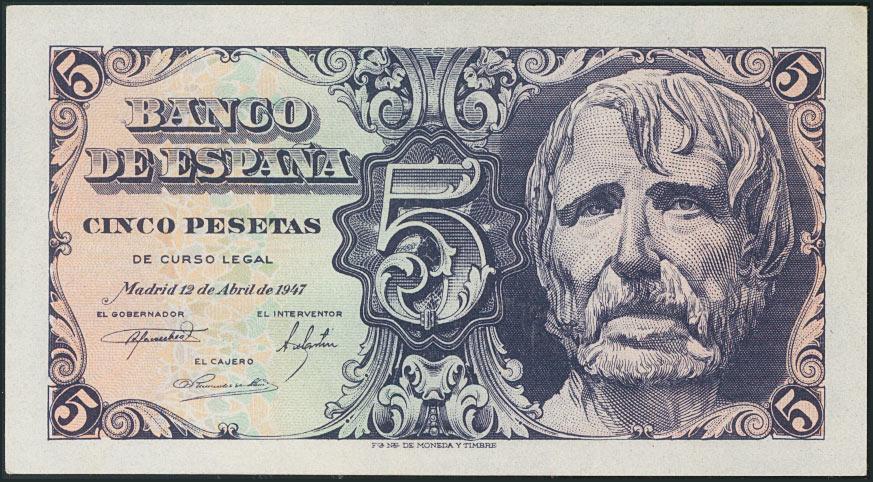 5 pesetas. 12 de Abril de 1947. Serie B. (Edifil 2017: 454a). SC.
