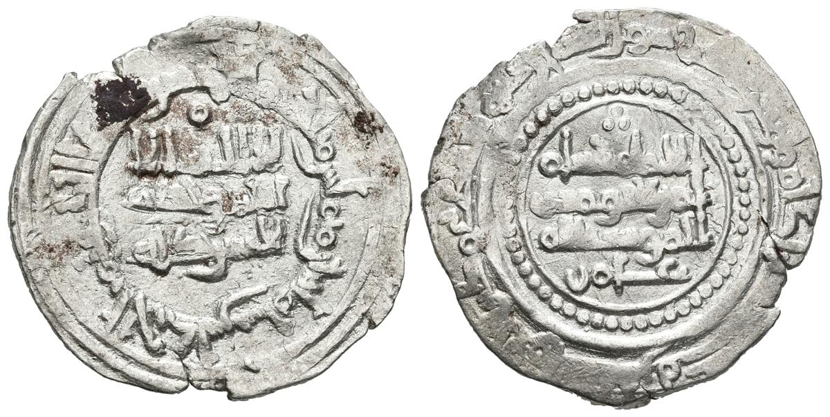 CALIFATO DE CORDOBA. Hisham II. Dirham. 382 H. Al-Andalus. Citando a´Amir en la IIA e inusual orla de puntos. Vives 515. Ar. 3,40g. Depósitos. MBC. Escasa.
