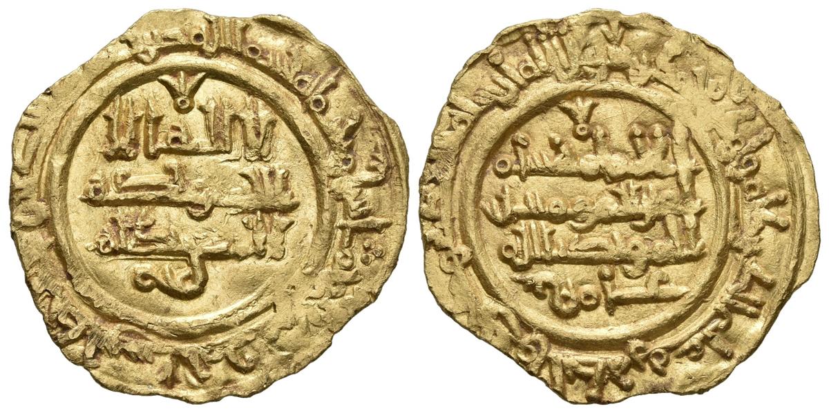 CALIFATO DE CORDOBA. Hisham II. Dinar. 385 H. Al-Andalus. Citando a `Amir en la IIA. Curiosa decoración floral en la orla exterior, coincidiendo en ambas caras. Vives No cita; Miles 305a. Au. 3,90g. MBC+. Rara.
