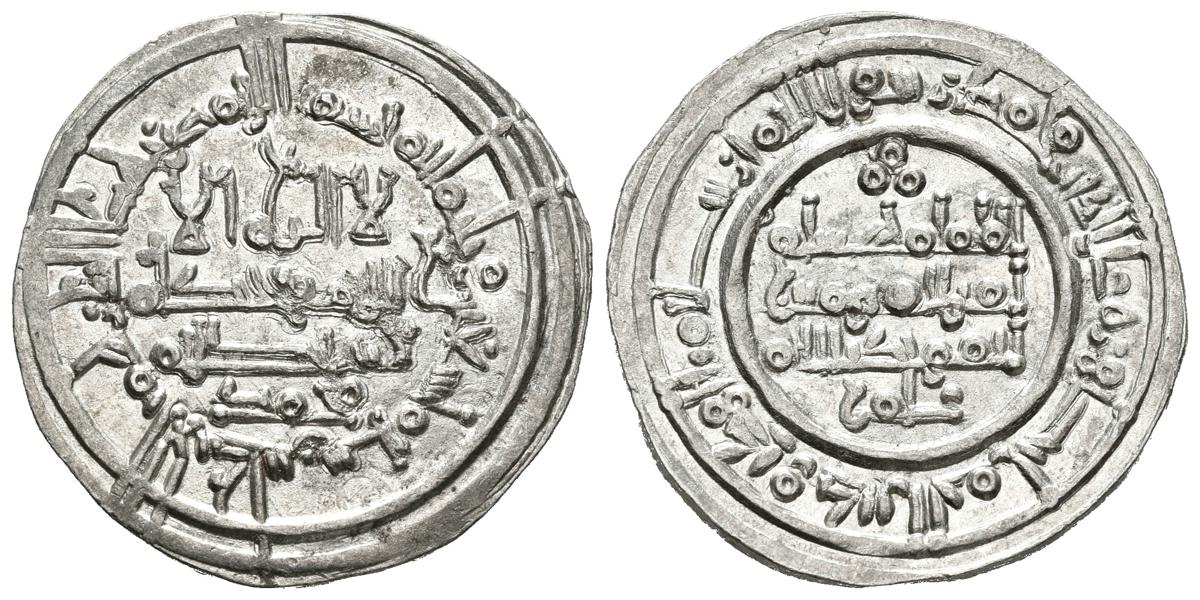 CALIFATO DE CORDOBA. Hisham II. Dirham. 390 H. Al-Andalus. Citando a Muhammad en la IA y ´Amir en la IIA. Curiosa decoración en la terminacion de la leyenda central en la IA. Vives 545. Ar. 3,77g. Buen ejemplar. EBC+.