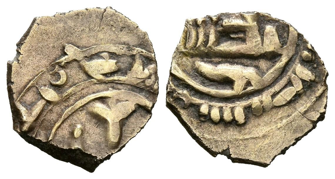 TAIFA DE CORDOBA. Banu Djahwar. Fracción de Dinar. 422-462 H. Córdoba. A nombre del Imam Abd Allah. Frochoso: Las monedas de los Banu Yahwar de Córdoba 422-462H. /1031-1070 d.C. pág. 197; Prieto suplemento nº167 (Atribución incierta). Au. 0,59g. MBC. Rara.