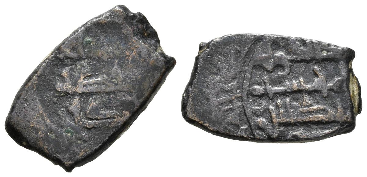 TAIFA DE ZARAGOZA. Imad al-Dawla Ahmad I Ibn Sulayman, AL-MUQTADIR. Fracción de Dirham. 441-475H. Saraqusta (Zaragoza). Ae. 2,36g. MBC-/BC+.