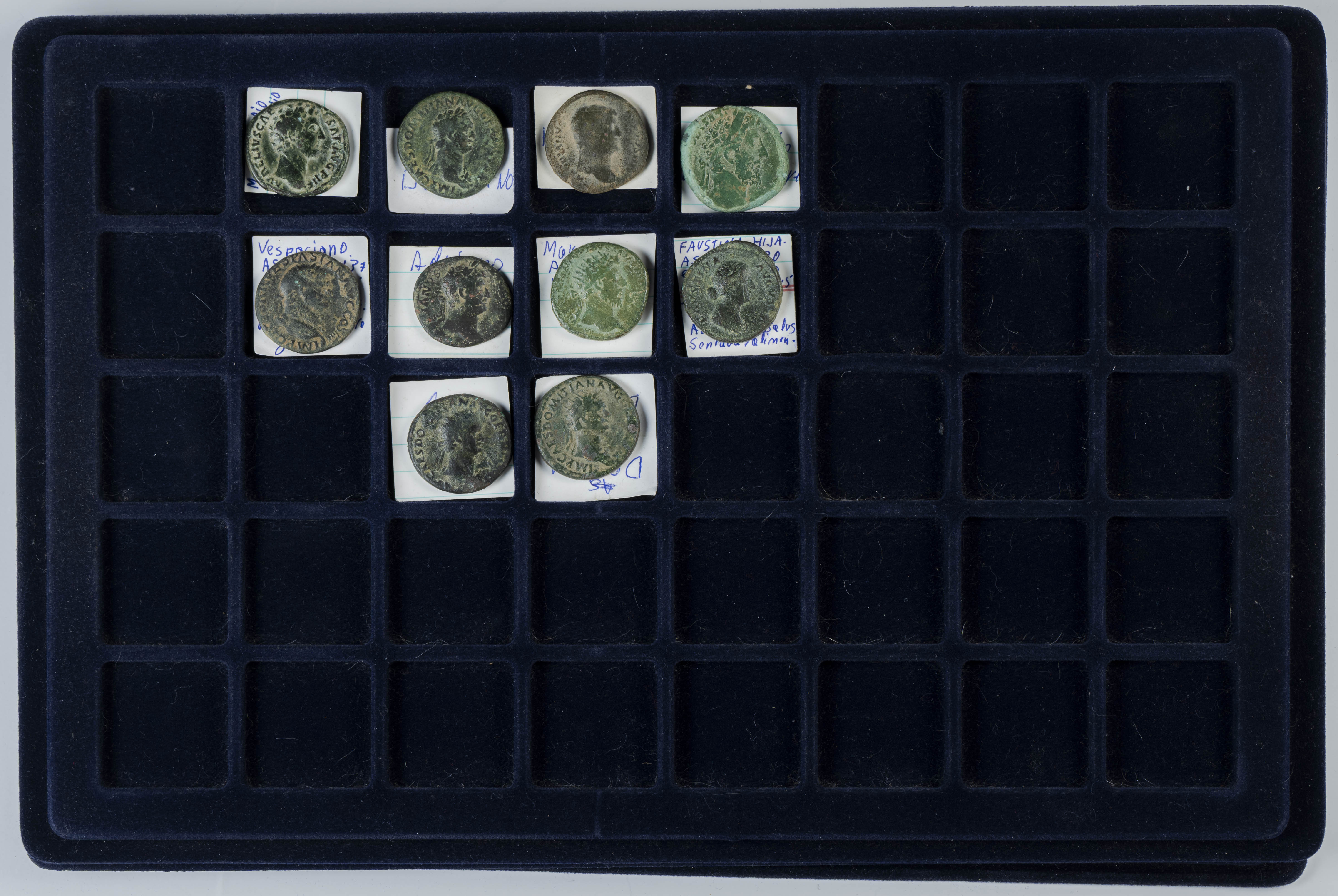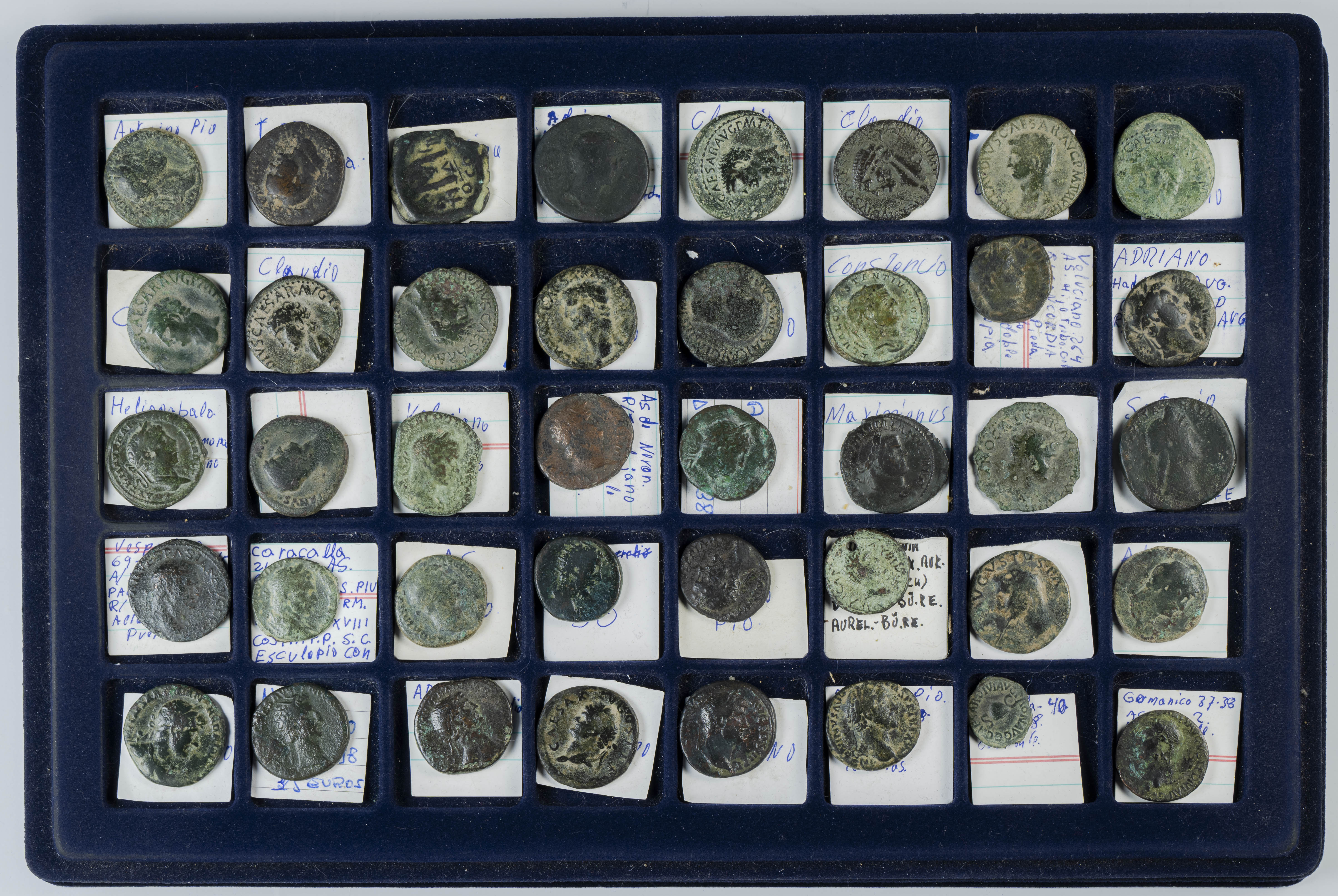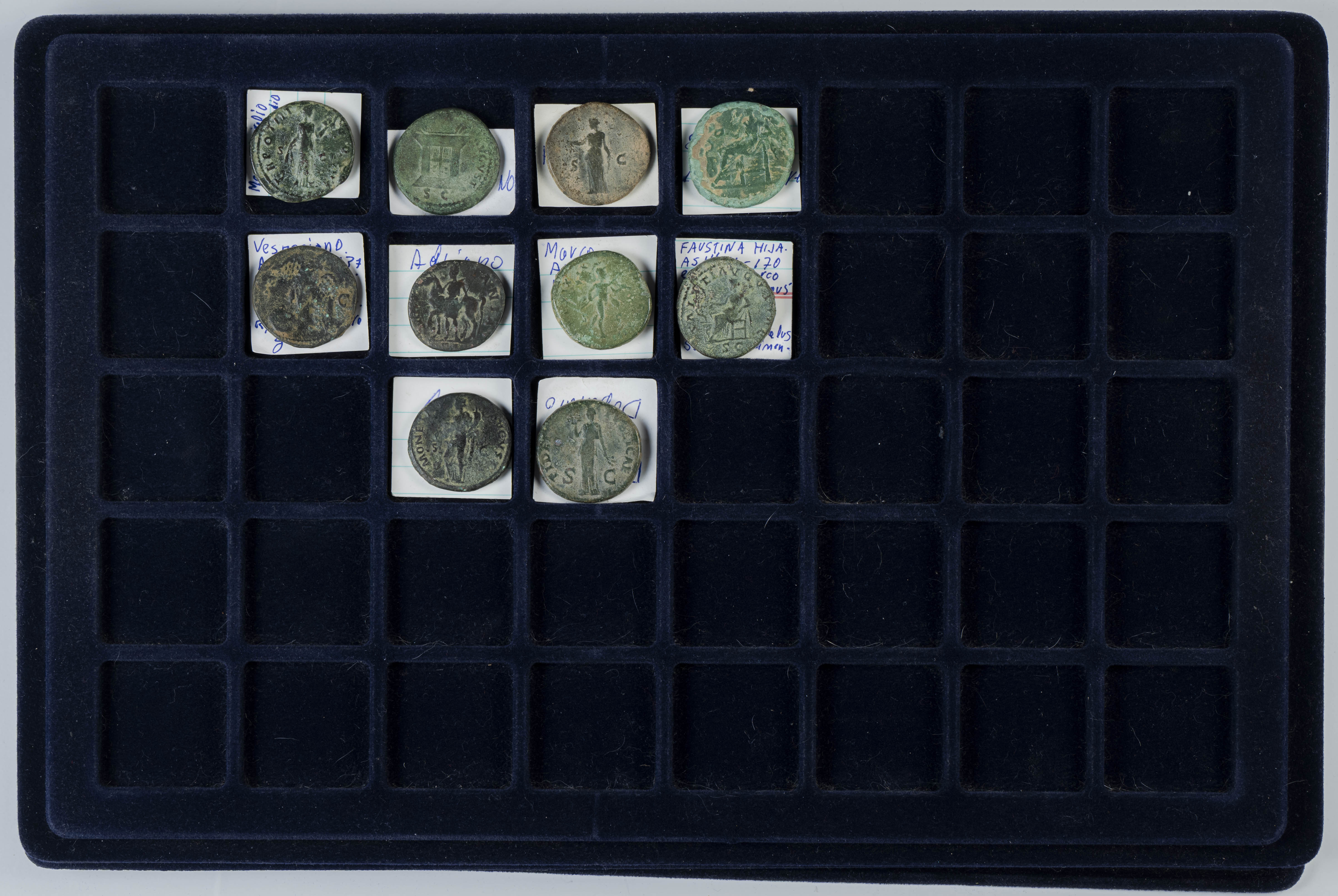 English ROMAN EMPIRE. A very interesting collection consisting of 76 bronzes, the vast majority of them sestertii, ases, and dupondii from the High Imperial period. Among the most notable are the examples in the names of Hadrian, Trajan, Vespasian, Domitian, Marcus Aurelius, Commodus, Nerva, Herennius Etruscan, Faustina, Crispina, and Sabina, among others, all presented on trays with notes from the collector. Of note is the wide variety of emperors and reverses, some of them rare, as well as the interesting quality of some pieces. Different sizes and states of conservation. ESSENTIAL TO EXAMINE.