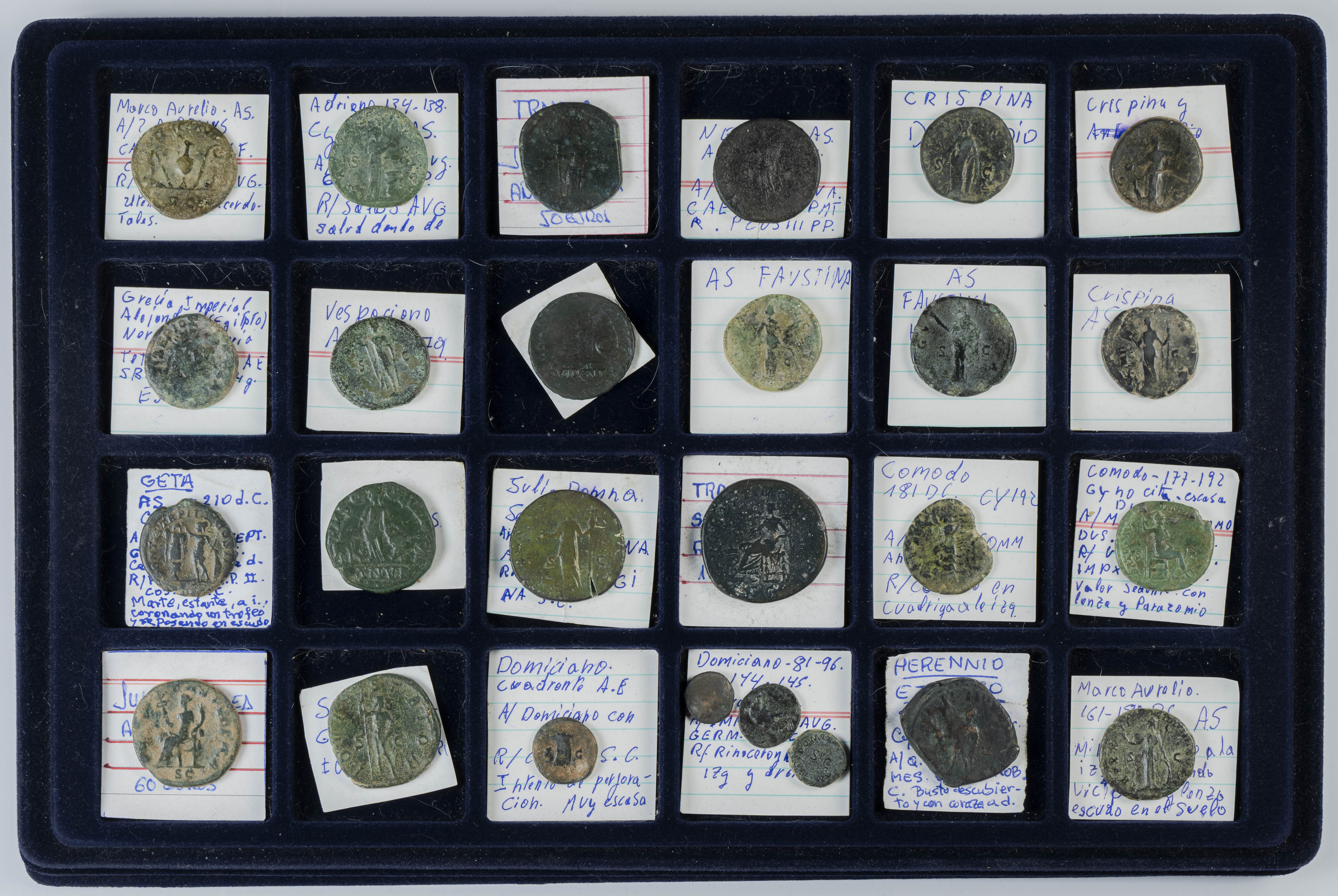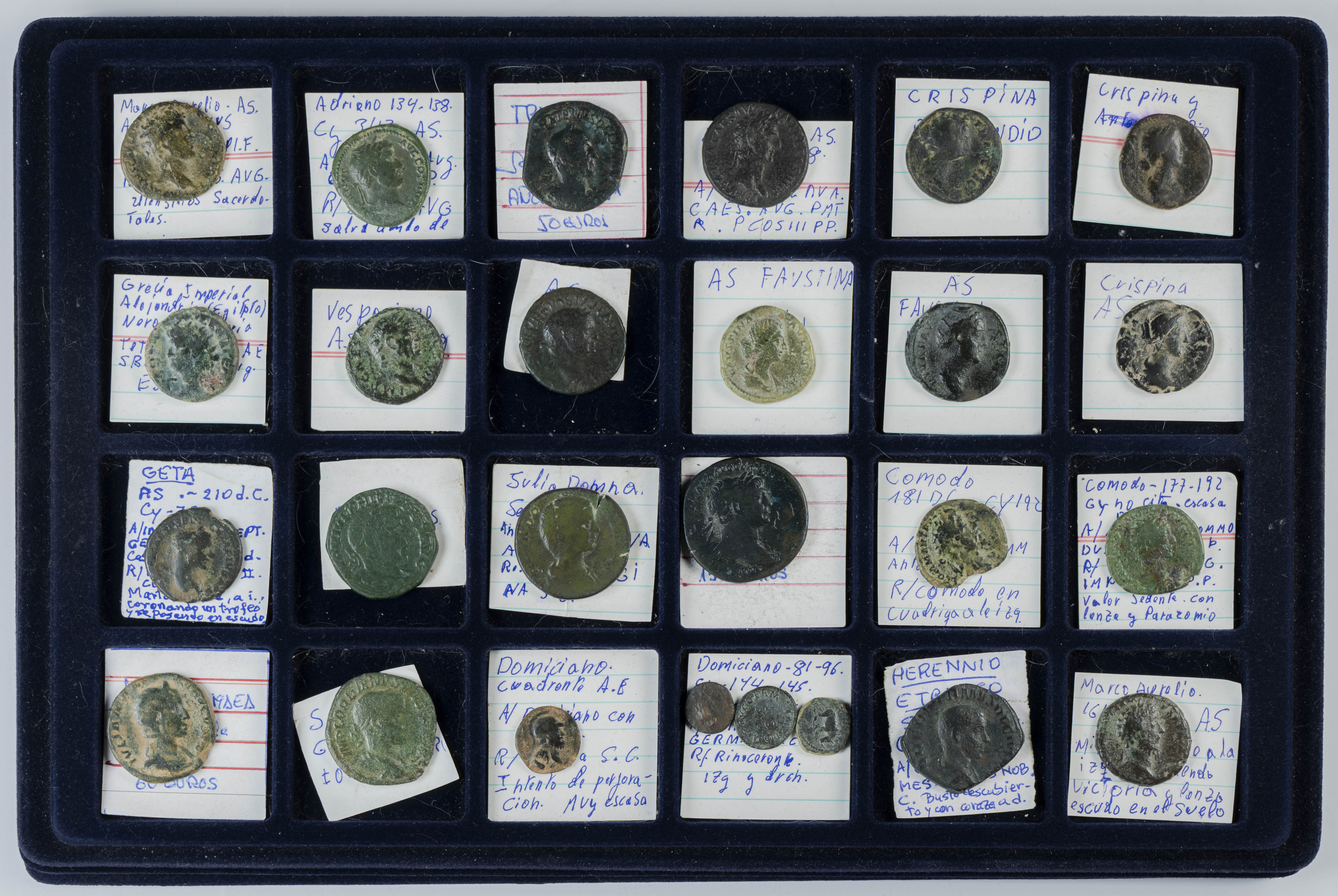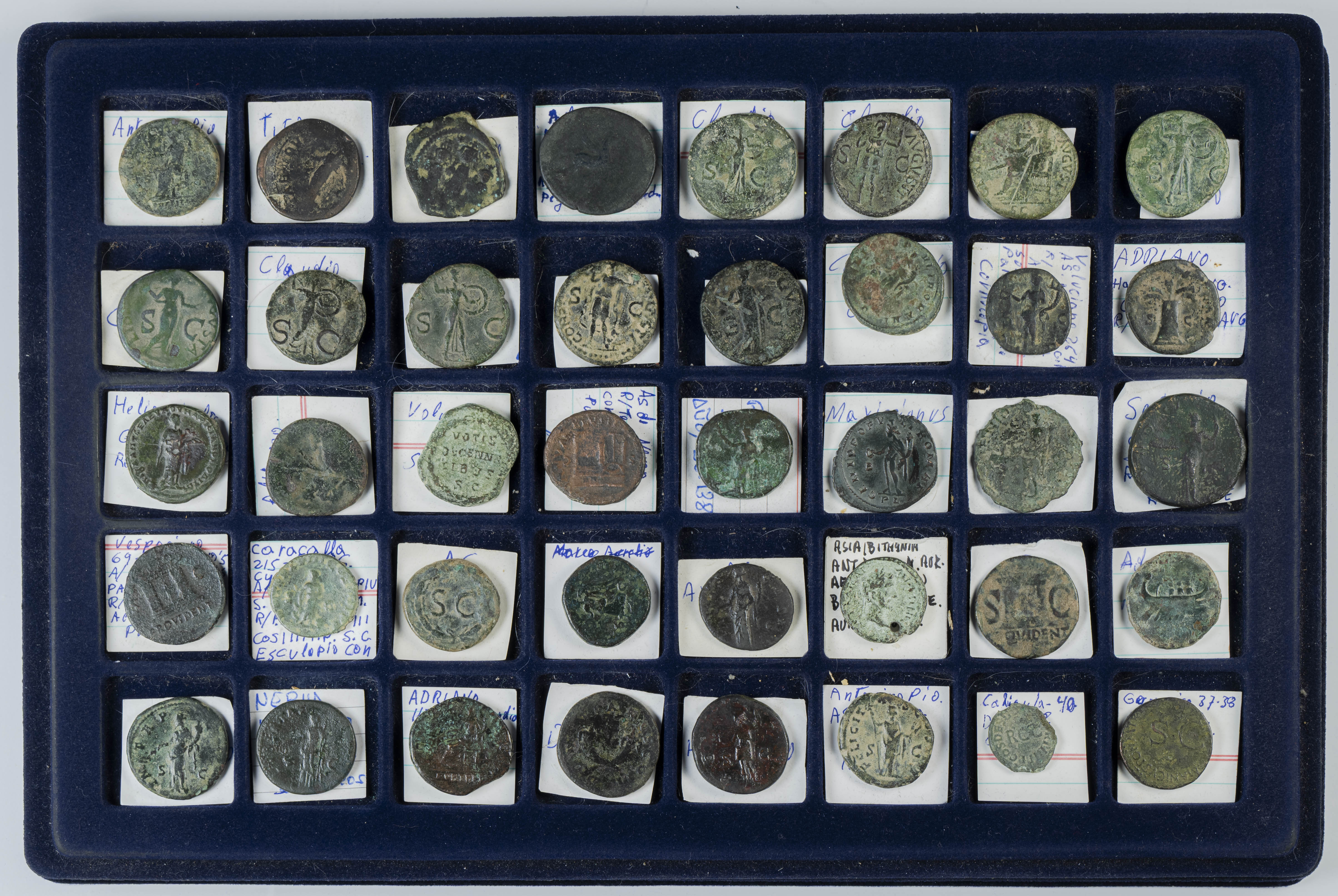 English ROMAN EMPIRE. A very interesting collection consisting of 76 bronzes, the vast majority of them sestertii, ases, and dupondii from the High Imperial period. Among the most notable are the examples in the names of Hadrian, Trajan, Vespasian, Domitian, Marcus Aurelius, Commodus, Nerva, Herennius Etruscan, Faustina, Crispina, and Sabina, among others, all presented on trays with notes from the collector. Of note is the wide variety of emperors and reverses, some of them rare, as well as the interesting quality of some pieces. Different sizes and states of conservation. ESSENTIAL TO EXAMINE.