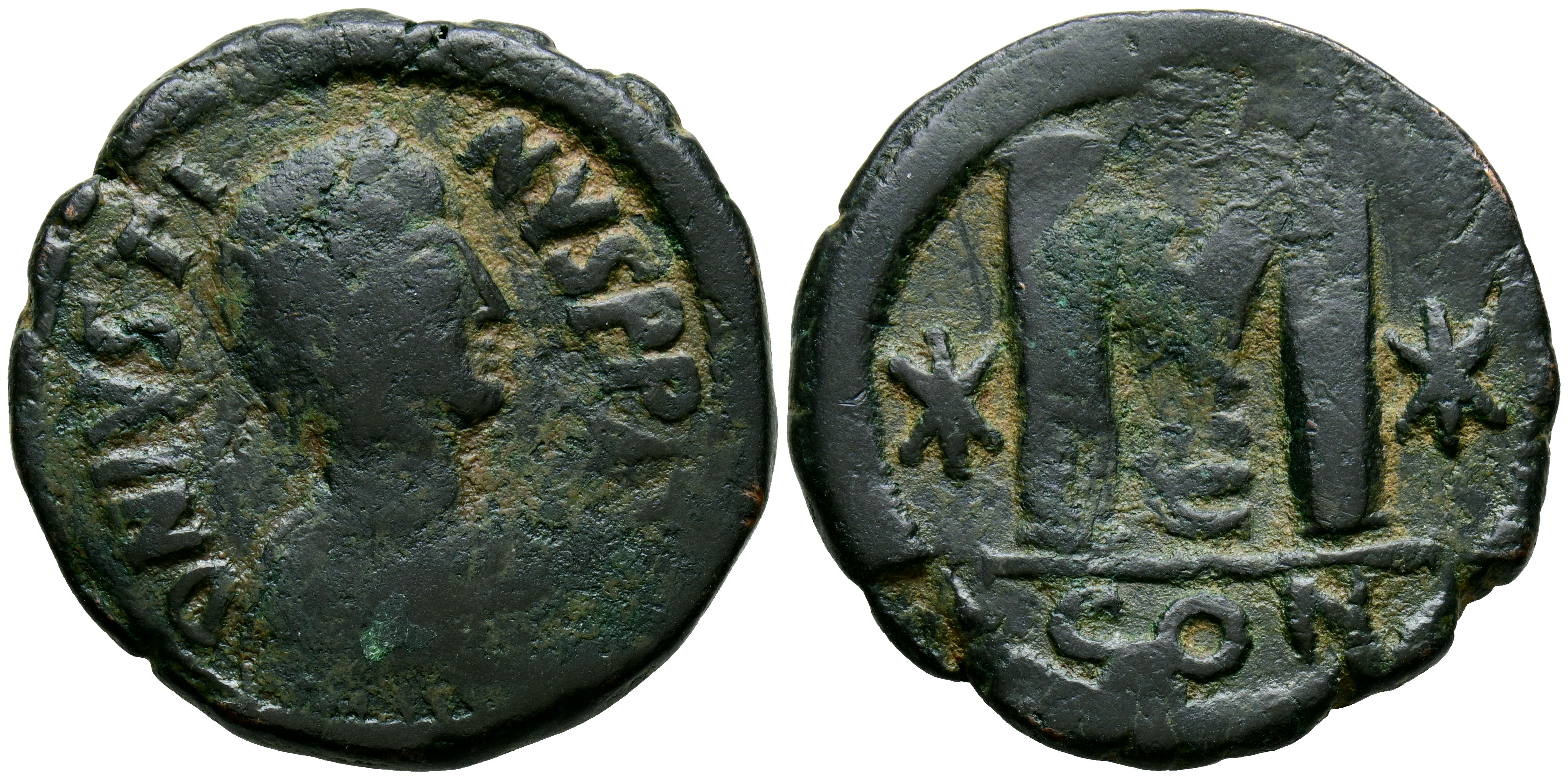 English JUSTIN I. Follis. (Ae. 17.00g/33mm). 518-527 AD Constantinople. (Seaby 62). Obv: Laureate and draped bust of Justin I facing right, surrounding legend: DN IVSTINVS PP A. Rev: Large M, Cross above and E below, stars at the sides, in exergue: CON. VF-.
