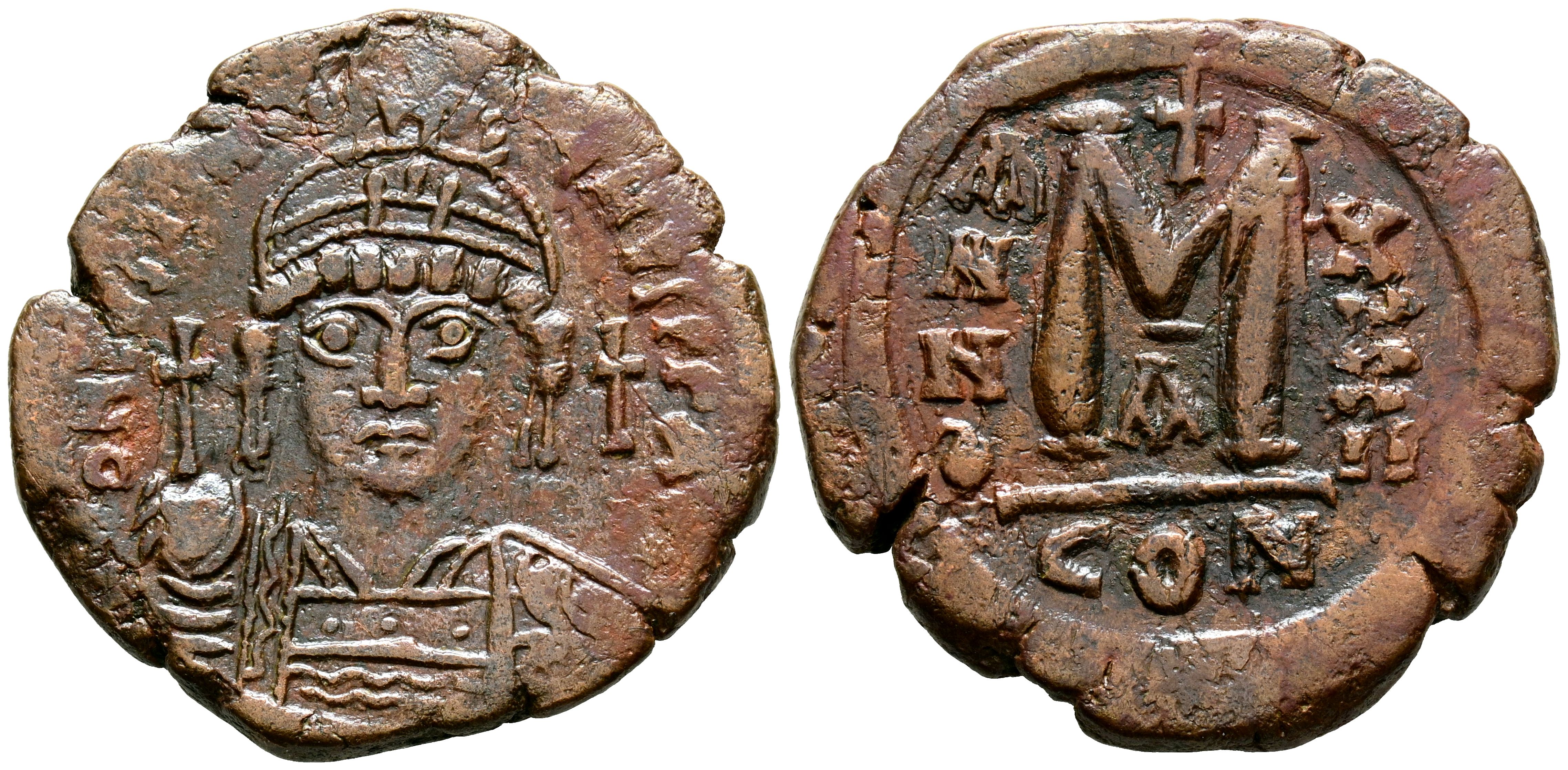 JUSTINIAN I. Follis. (Ae. 14.65g/32mm). 557-8 AD Constantinople. (Seaby 163). Obv: Laureate and draped bust of Justinian I facing front, around legend: DN IVSTINIANVS PP AVG. Rev: Large M, cross above and monogram A below, sides: A/N/N/O - X/X/X/II, in exergue: CON. VF-. Cleaned.