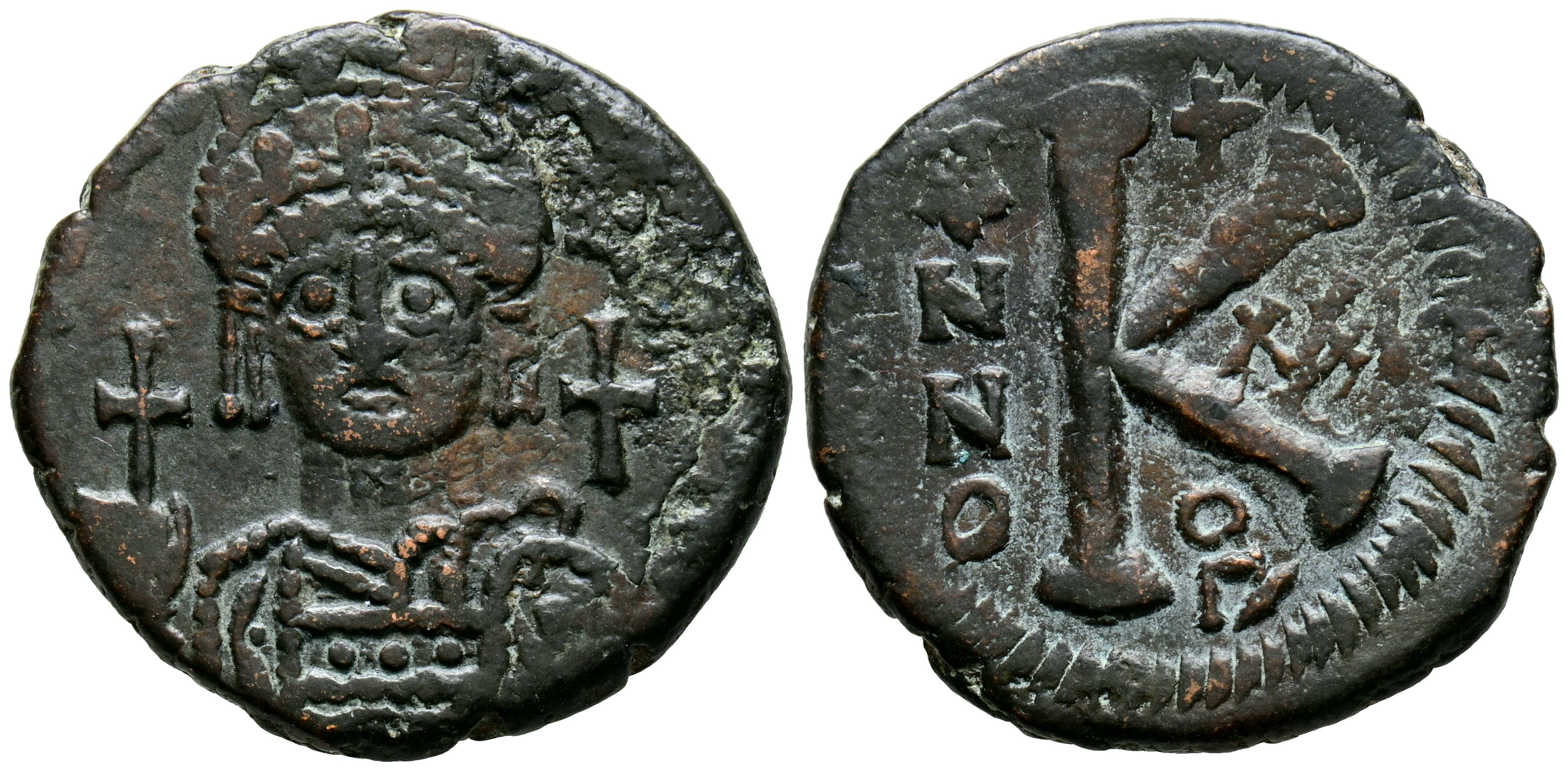 JUSTINIAN I. 1/2 Follis. (Ae. 9.43g/27mm). 548-549 AD Antioch. (Seaby 230). Obv: Crowned and armoured bust of Justinian facing front, holding a cruciform globe in the left and a shield in the right, around which legend: DN IVSTINIANVS PP AVG. Rev: Large K; above Chrismon, on the sides: A/N/N/O - XXI (date), below: Or. VF.