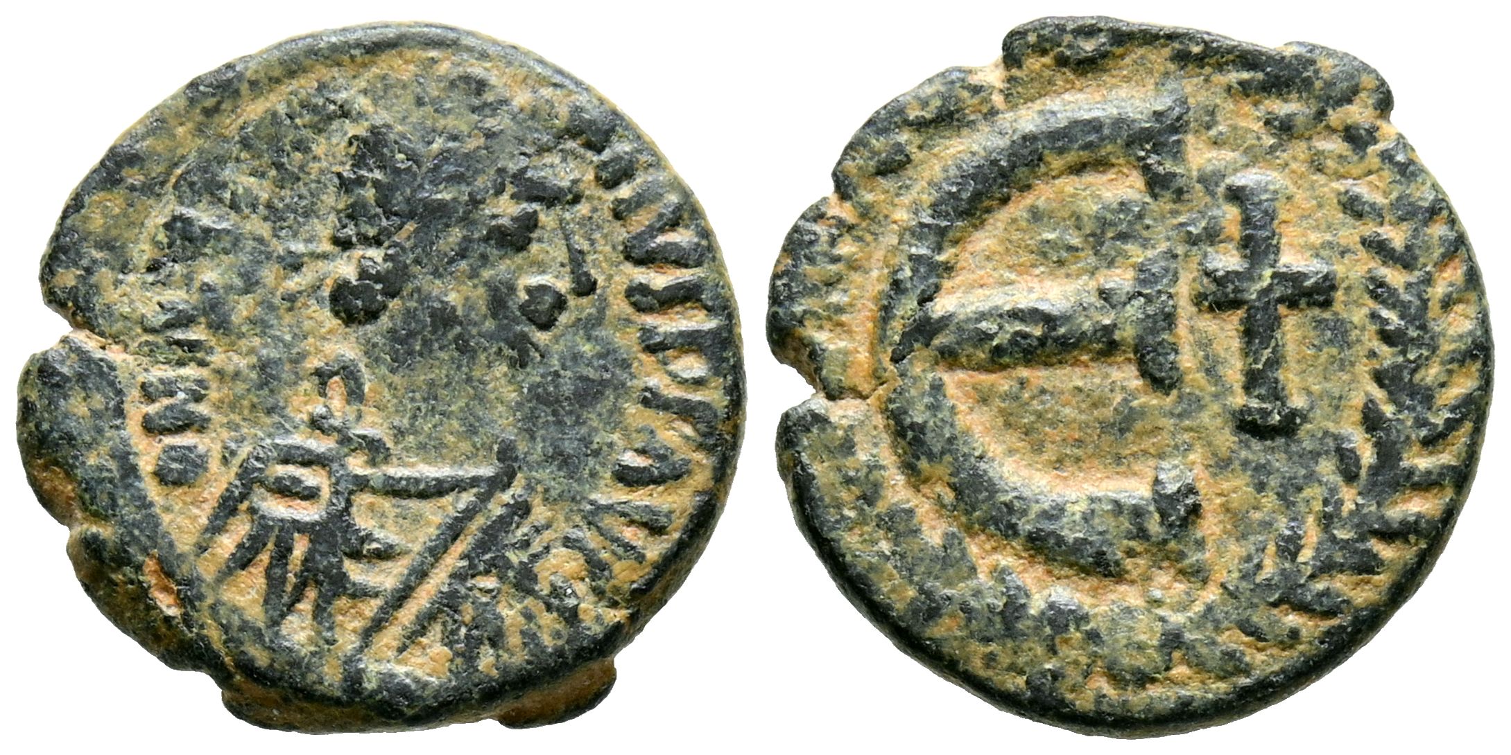 JUSTINIAN I. Pentanummio. (Ae. 1.83g/15mm). 537-551 AD Carthage. (SeaBY 274). Obv: Diademed and draped bust of Justinian I facing right, with a legend around it. Rev: Large E, facing right, a cross, all within a laurel wreath. VF.