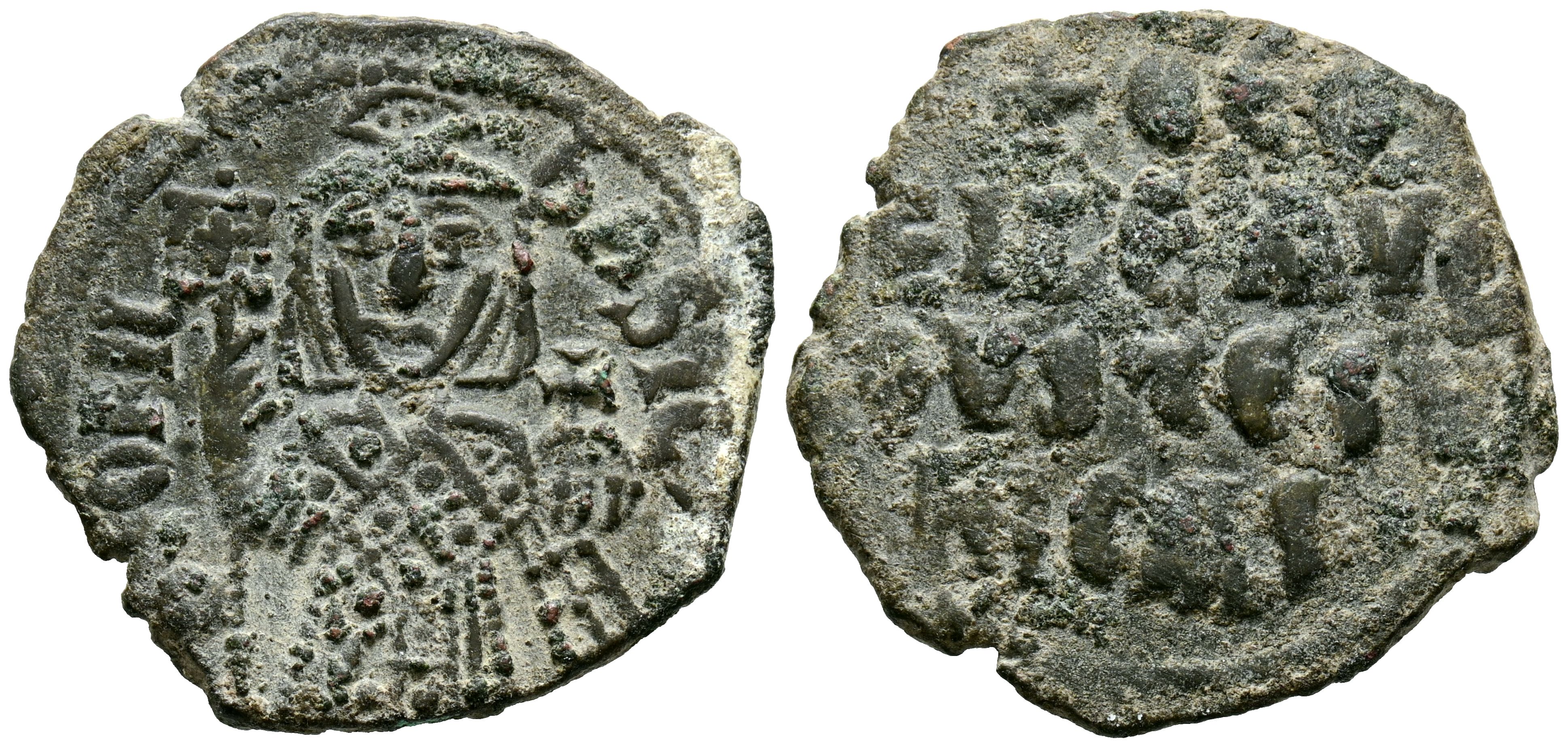 English THEOPHILUS. Folllis. (Ae. 6.92g/27mm). 829-842 AD Constantinople. (Seaby 1667). Obv: Full-frontal bust carrying a standard and cruciferous globe, surrounding legend: ΘEOFIL BASIL. Rev: Legend in four lines: + ΘEO-FILE AVG-OVSTE SV hICAS. VF/VF-.