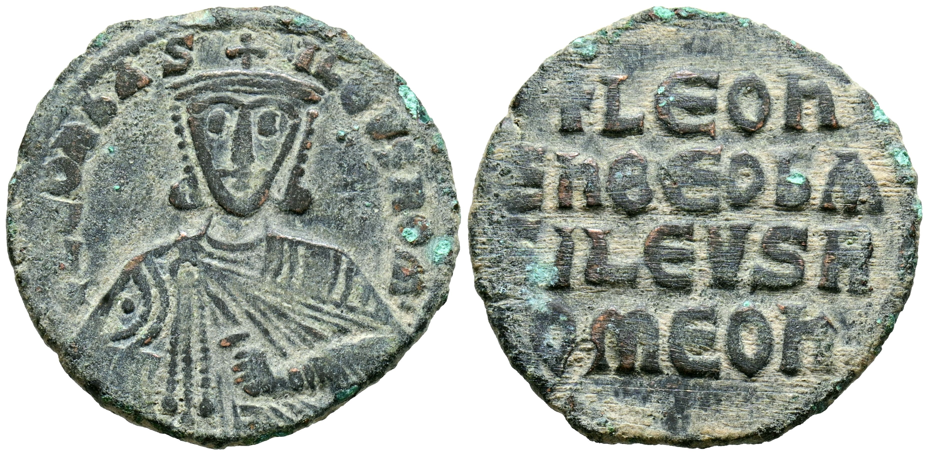 LEO VI. Follis. (Ae. 5.75g/26mm). 886-912 AD Constantinople. (Seaby 1729). Obv: Crowned and draped bust of Leo VI facing forward carrying an akakia, with the legend around it: LEON BASILEVS ROM. Rev: Four-line legend: LEON/En TEO bA/SILEVS R/OMEOn. VF. Oxidations.