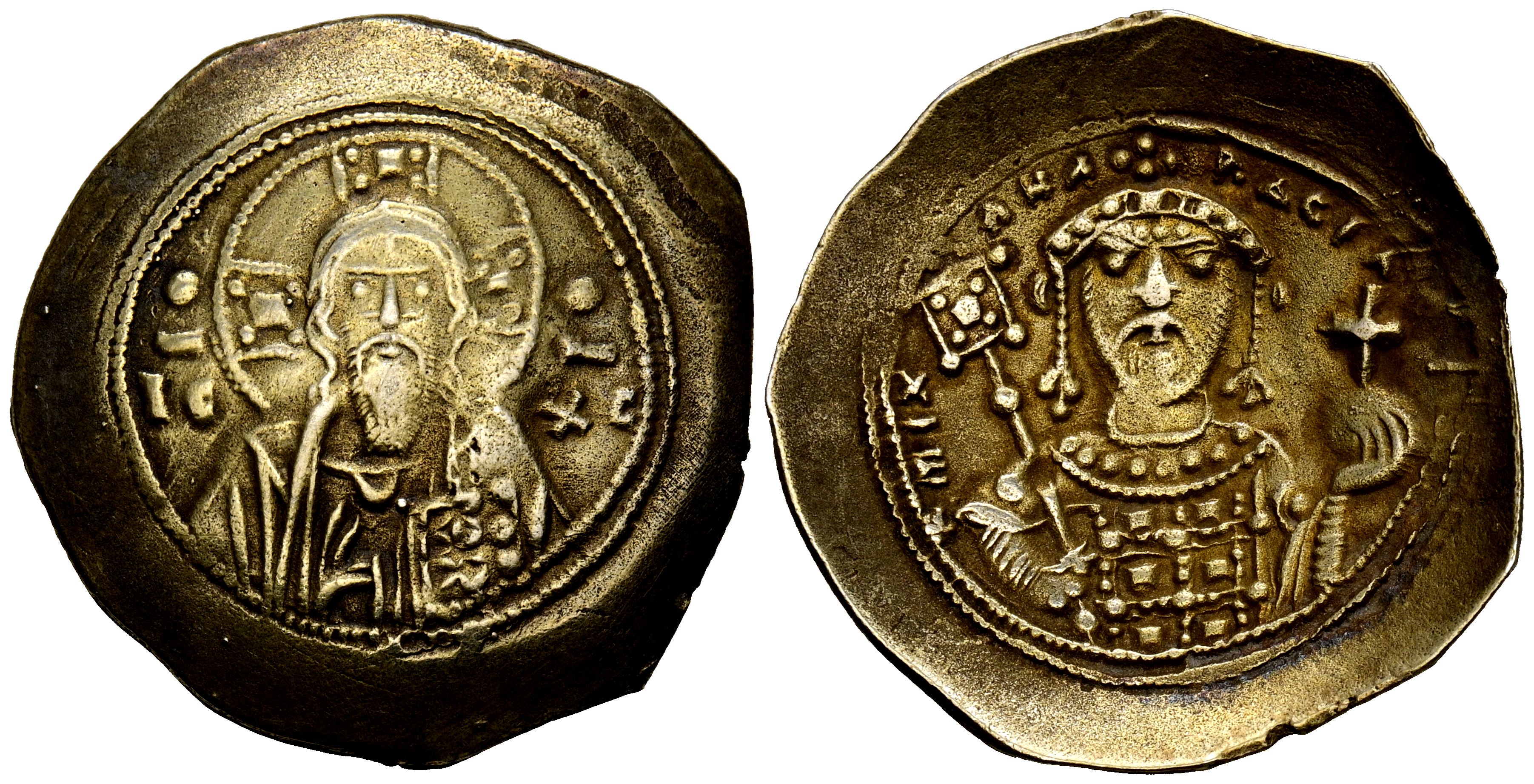 MICHAEL VII Ducas. Histamenon. (El. 3.20g/26mm). 1071-1078 AD Constantinople. (Seaby 1868; DOC 2d). Obv: Full-length portrait of Christ Pantokrator, between: IC-XC. Rev: Crowned bust of Michael II, full-length, with parrots, carrying a cruciform globe and labarum, above which lies the legend: MIX AHΛ RACIΛ O Δ. VF.