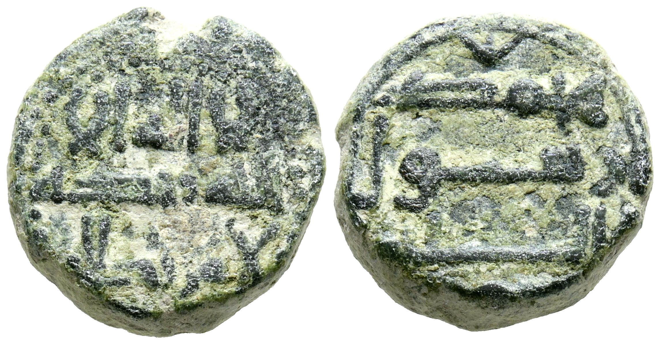 EMIRATE DEPENDENT ON CÓRDOBA, GOVERNOR PERIOD. Anonymous. Felús. (Ae. 4.67g/16mm). Unknown. (Frochoso 13th-m). Three lines of religious legend in both areas, surrounded by a double beading of dots and decoration. VF+. Scarce and even more so.