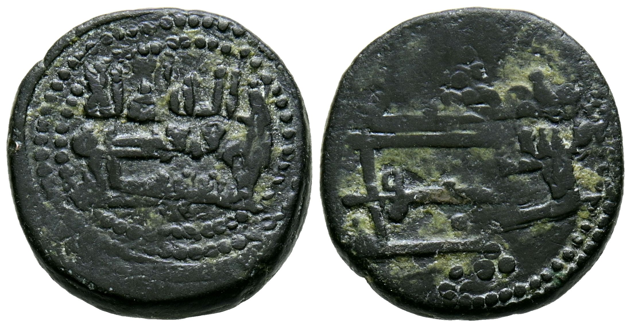 English DEPENDENT EMIRATE OF CÓRDOBA, GOVERNOR PERIOD. Anonymous. Felús. (Ae. 2.72g/15mm). Unknown. (Frochoso 13th century). Three lines of religious legend in both areas, surrounded by a double dot beading and a dot triangle decoration on the reverse. VF+. Scarce and even more so.