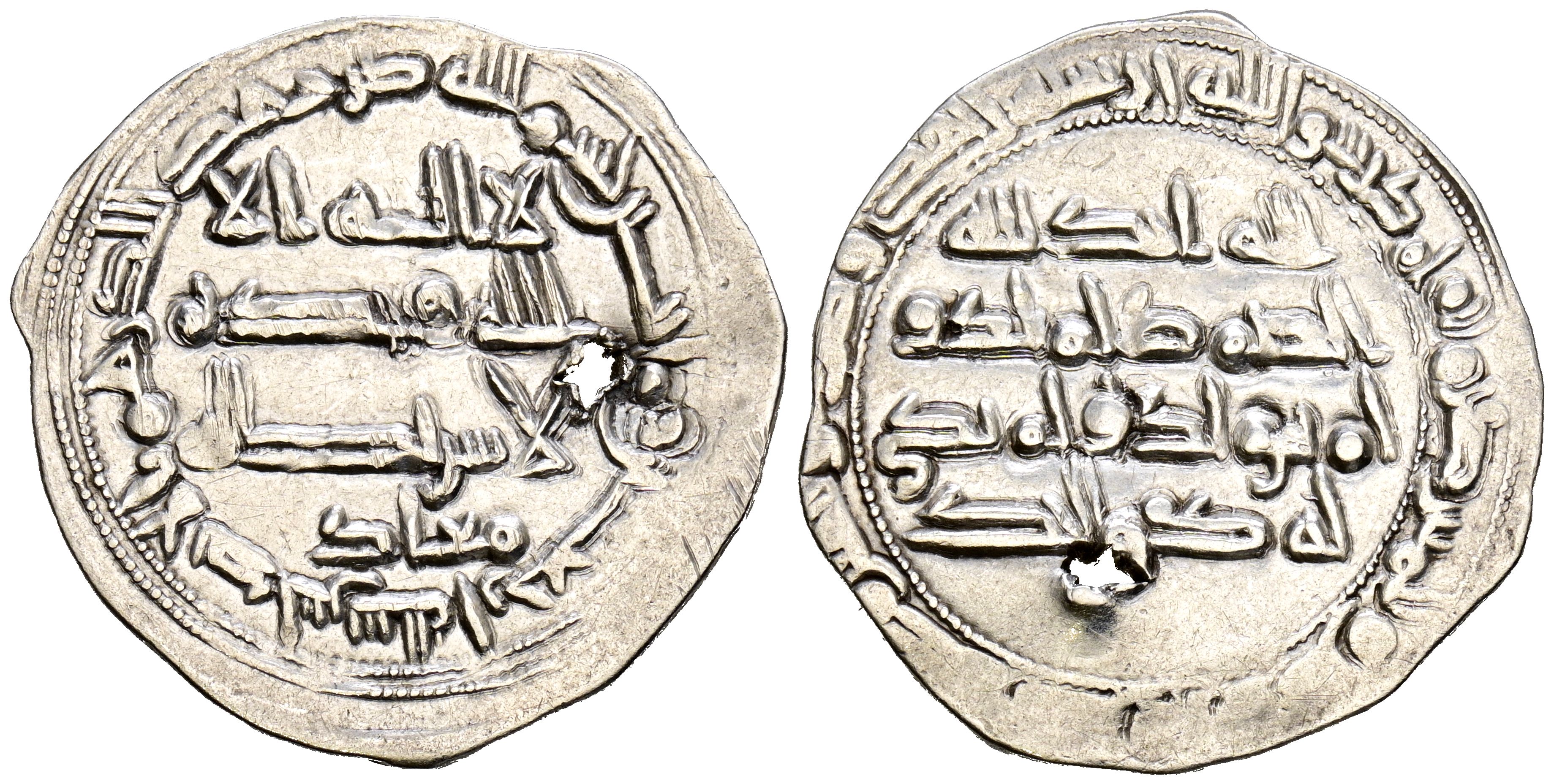English INDEPENDENT EMIRATE OF CÓRDOBA, Muhammad I. Dirham. (Ar. 2.38g/26mm). 240H. al-Andalus / الاندلس. Quoting Mu'ad/معاد in IA. (Vives 235; Frochoso 240.12). Very Fine-. Small perforation that does not affect any of its legends.