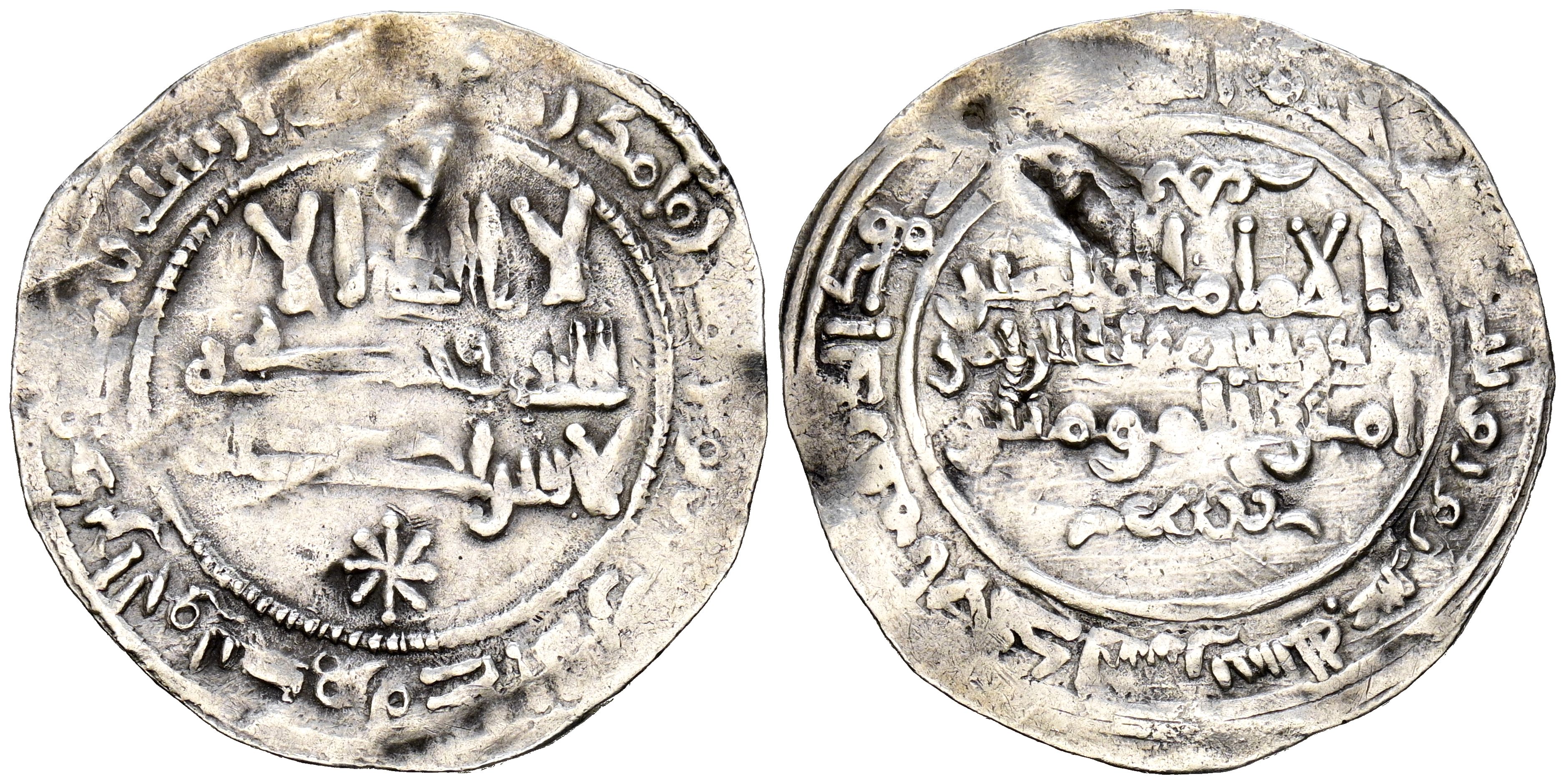English CALIPHATE OF CORDOBA, Abd al-Rahman III. Dirham. (Ar. 2.19g/26mm). 320H. al-Andalus / Al-Andalus. (Vives 363; Frochoso 320.6: IA: C5, IM: M2, IIA: C4, IIM: M1). Obv: 'Sahada' (central legend) in 3 lines with star at the bottom; Cartouche with legend M2. Rev: Central legend M1 (name and titles of the Caliph) above and below leaf-shaped ornaments; Cartouche with legend M1: 'Basmala' with date and mint in the form: ...بالاندلس سنة عشر ين و ثلث.. (in al-Andalus year 20 and 3...). Very Fine. Vain. Even so, extraordinary and very rare specimen.