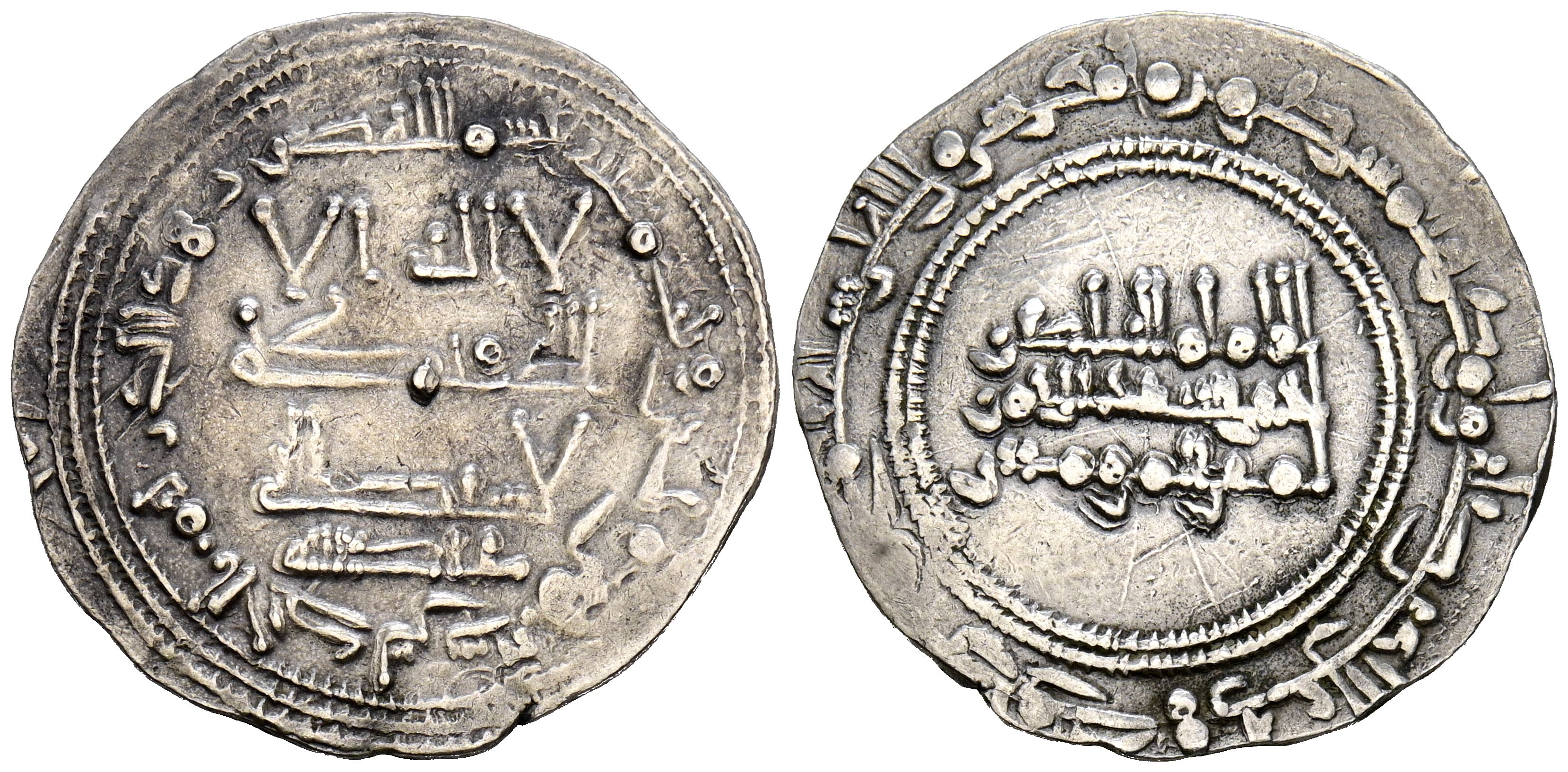 English CALIPHATE OF CÓRDOBA. 'Abd al-Rahman III. Dirham. (Ar. 2.98g/23mm). 335H. al-Andalus / الاندلس. (Vives 411; Frochoso 335.17). Quoting 'Abd Allāh / عبداللة in IA. Very Fine.