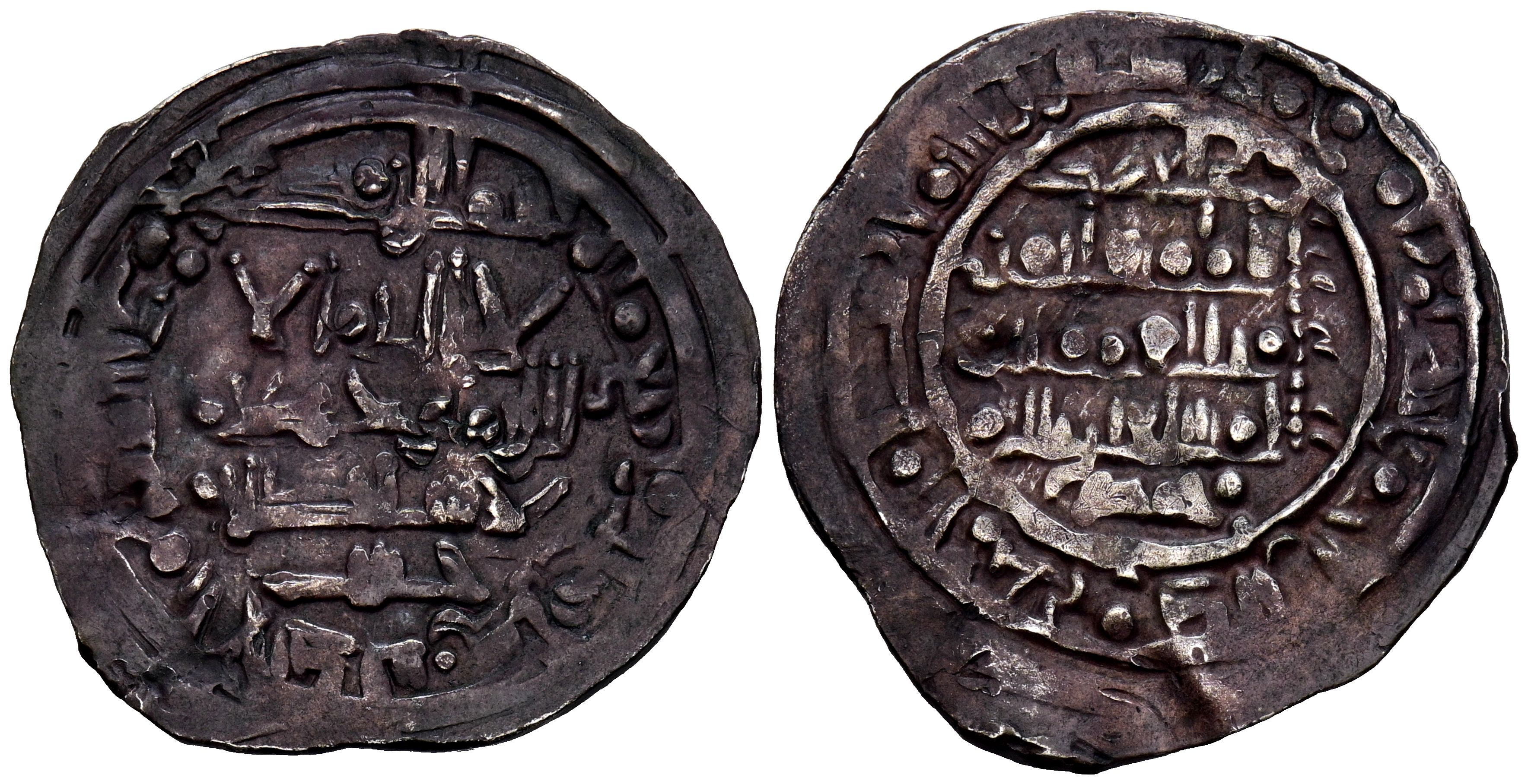 CALIPHATE OF CORDOBA, Suleyman (2nd reign). Dirham. (Ar. 2.65g/25mm). 403H. al-Andalus / الاندلس. (Vives 787; Prieto 20a). Quoting Habib/حبيب in IA. and to Crown Prince Mohammad: محمد / ولى العهد in IIA. Very Fine. Dark patina. Very rare.