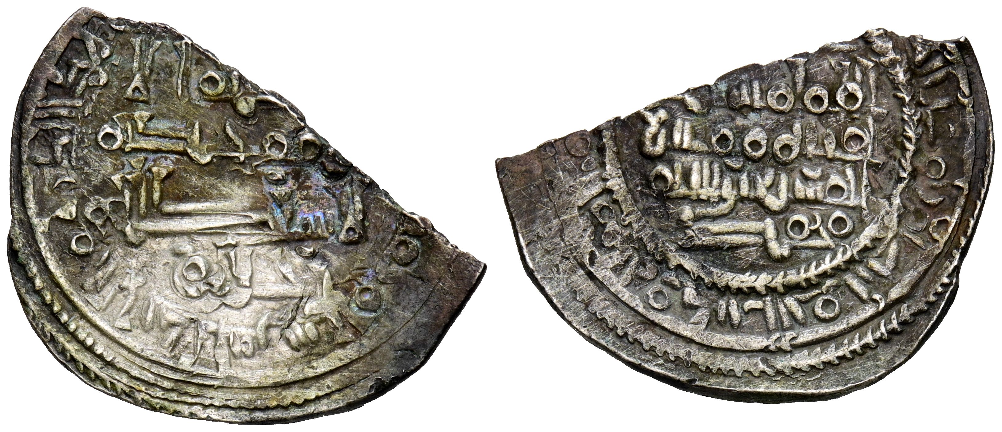 CALIPHATE OF CORDOBA, Suleyman (2nd reign). Dirham. (Ar. 2.47g/22mm). 405H. al-Andalus / الاندلس. (Vives 799; Prieto 28d). Quoting Ibn Khalaf / بن حلف in IA. and to Crown Prince Mohammad: محمد / ولى العهد in IIA. Very Fine. Fraction of 50%, with the mint and the unit: "5", perfectly visible. Very rare specimen.