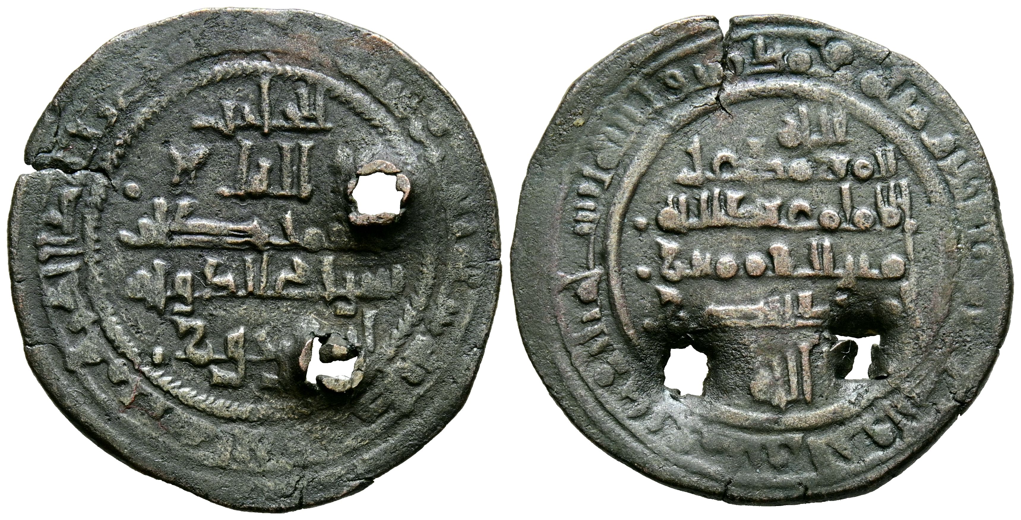English TAIFAS OF THE CALIPHATE, SEVILLE (Abadies). Muhammad Ibn Abbad, Al-Mu'tamid. Dirham. (Ve. 2.83g/25mm). 463H. Madinat Qurtuba (Córdoba) / مدينة قرطبة. (Vives 969; Prieto 418a; Jímenez 1587). Quoting ابن فرجون / الحاجب (al-hāyib Ibn Faryun) in IA. and الله (God) in IIA. Very Fine. Two perforations. Even so, beautiful and rare specimen.