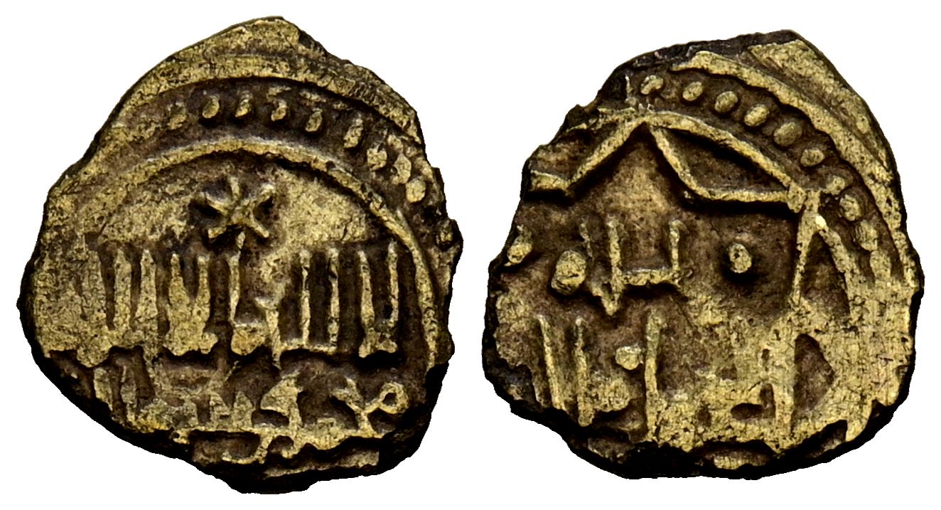 TAIFAS DEL CALIPHATE, Anonymous attributed to Toledo. Dinar fraction. (El. 0.31g/10mm). S/D. (Codera and Zaidin (1897) 1047 bis; Ibrahim, Cantó (2003) Supplement to the Kingdoms of Taifas, no. 169, French no. 362). Anv: لااله الاالله / محمدرسول الله. Rev: الحو ل و القوة / الله. (For God / power and might). Very Fine. Scarce. Codera attributed this coin to Almería ''because it bears some resemblance to some examples of No. 1047 by Vives, although the hoard where those examples appeared also contained other different ones from the taifas of Toledo, Badajoz, Córdoba, Valencia, Dénia and Zaragoza. However, preceding the intuition of Dr. Albert Cantó, it would be David Francés who would provide a more logical reasoning for its origin, in his book ''On legitimacy, successions and their reflection in Andalusian coinage'' pp. 137-139, justifying the attribution of this coin to Toledo, during the presence of 'Umar al-Mutawakkil, king of Badajoz'.