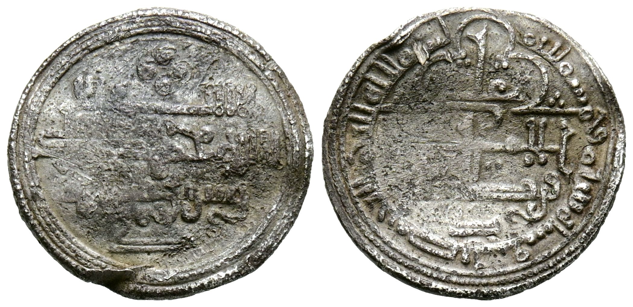 ALMORAVIDS, Ali ben Yusuf (500-537H). Quirate. (Ar. 0.95g/14mm). 506H. Córdoba / قرطبة. (Benito Ca6var; Medina 134var). Obv: 'Shahadah' in three lines. Rev: Presents Ali in the center without titles or heir, around 'Basmala' with a variant of the date expression 'Fi sana' and the unit (6) in feminine: في سنة ستة... At the bottom of both areas we find the letter: ك isolated. VF. Minting openings. Warped. Very rare, we have no record of any other specimen with this peculiarity.