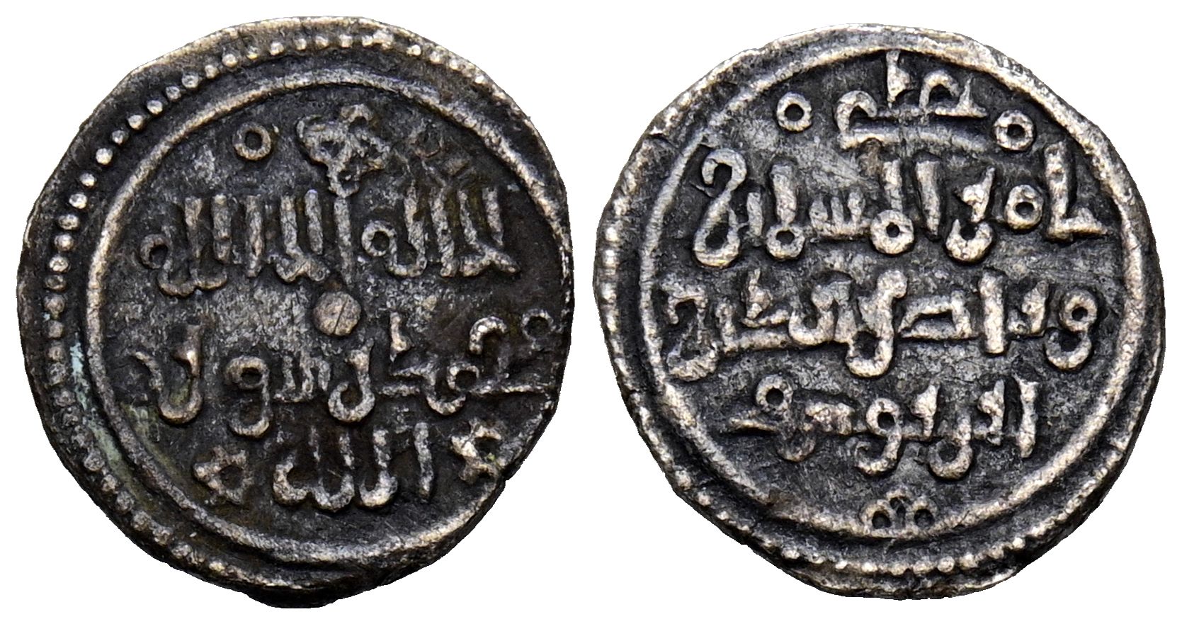 ALMORAVIDS, Ali ben Yusuf (500-537H). Quirate. (Ar. 0.85/12mm). Obv: 'Shahada' in three lines. Rev: Divided into four lines, it presents Ali with the titles of Amir al-Muslimin and Nasir al-Din, with no mention of the heir. VF+. Dark patina. Distribution of legends: Unpublished.