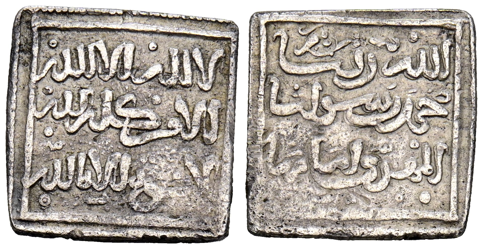 ALMOHADS, Anonymous citing Al-Mahdi. Dirham. (Ar. 1.39g/13mm). Uncut. (Vives 2088var; Medina type 201; Hohertz 578var). Letter ب (Ba) instead of mint. VF. Interesting specimen for study.