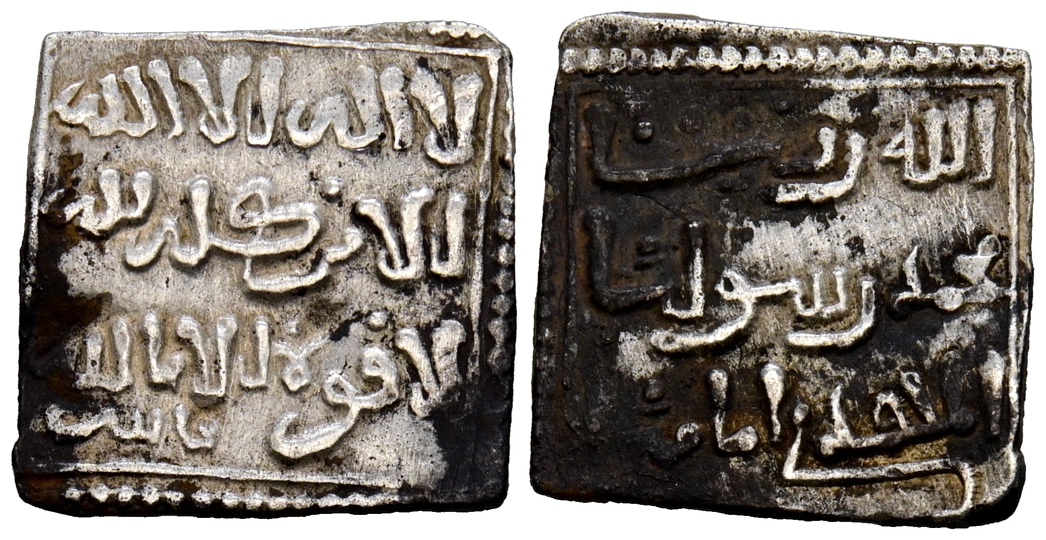 English ALMOHADS, Anonymous citing Al-Mahdi. Dirham. (Ar. 1.45g/14mm). Fez / فاس. (Fontenla Ballesta 1985: p275; Hohertz A577 var, catalogued as RRR). Piece with mixed script featuring nasji style on the obverse and kufic on the reverse. VF. Oxidations. Very rare. We have no record of any other example with mixed script containing a mint.