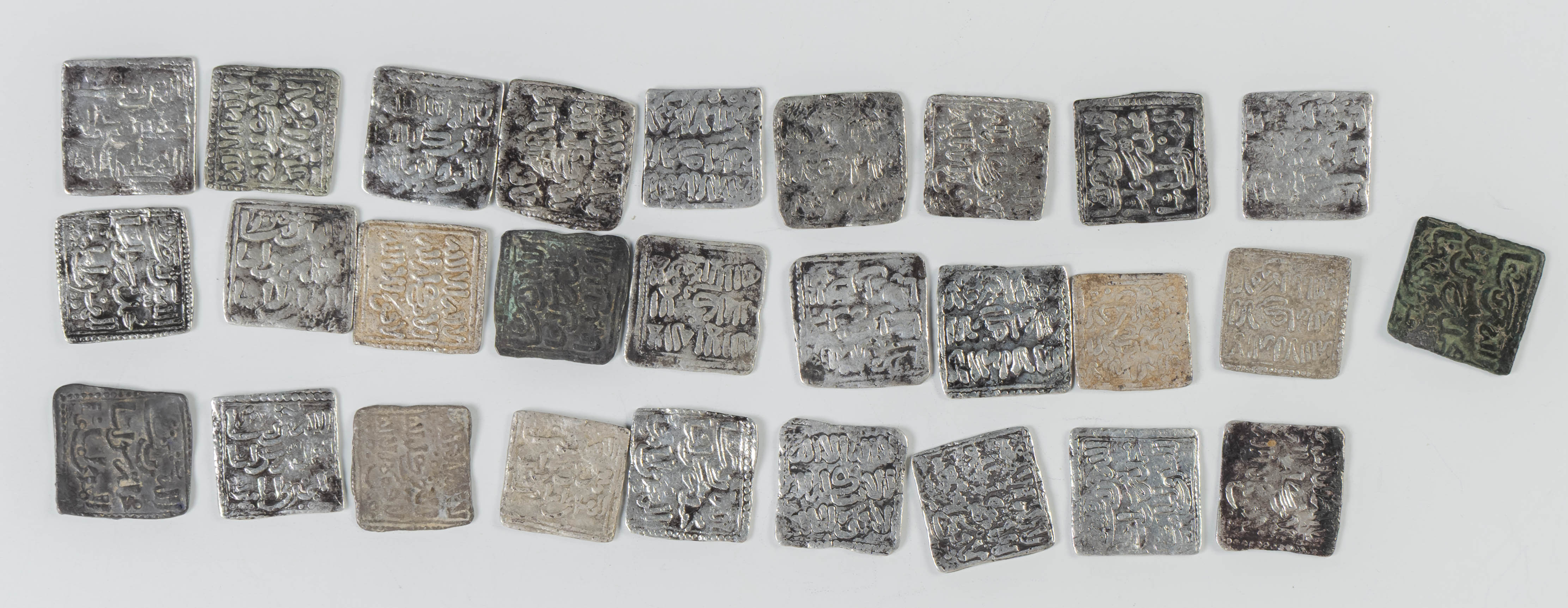 ALMOHADS, An interesting collection of 28 Dirhams, Vives 2088. It includes pieces in cruciform script, as well as some very interesting period forgeries. Various sizes and states of preservation. FOR EXAMINATION.