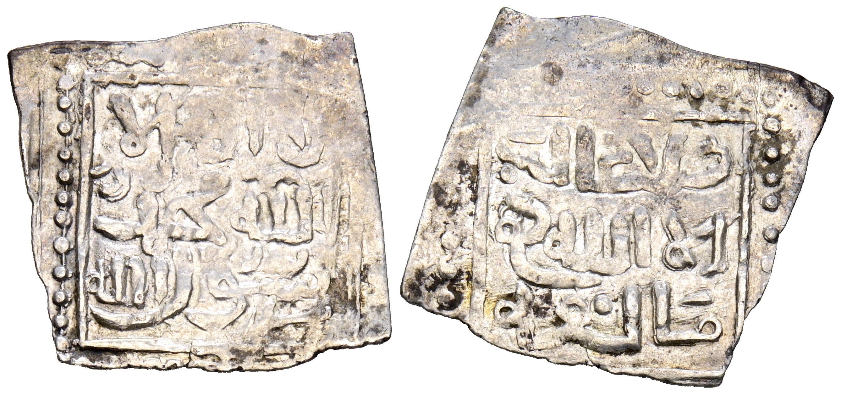 NAZARIES OF GRANADA, Anonymous. 1/2 Dirham. (Ar. 0.84g/16mm). Mālaqa (Málaga) / مالقة. (Vives 2195; Medina 266b; Hohertz 753). With "ta", abbreviation of the word ta'ālà / تعالى meaning "praised be he". Good Very Fine.