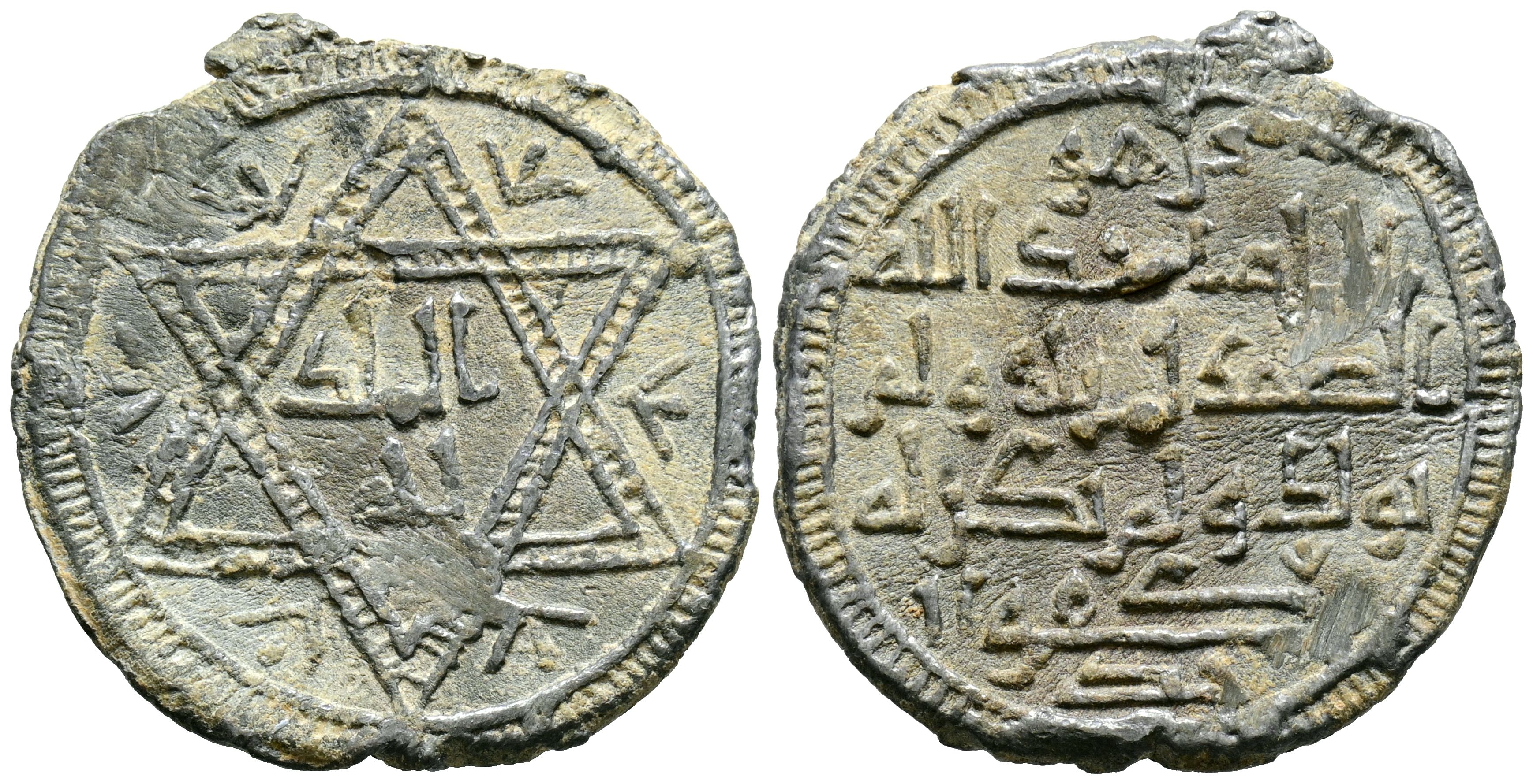 CALIPHAL PERIDOD. Circular amulet-pendant. (Pb. 4.83g/26mm). Possibly 10th century. (Amulets 121-G11. Type BI). Monetiform lead plaque with remains of two fastening rings at the top. A border of small radial lines runs around the edge of both areas. Obv: Six-pointed star or seal of Solomon with a two-line legend: الملك / لله (Sovereignty belongs to God). The spaces between the outer border and the star are each occupied by a three-pointed, outward-facing, spike-shaped motif. Rev: Divided into six lines Quranic text in Kufic: كفوا أ / حد. (Say: He is the One God, the Eternal God, he did not beget and was not begotten, and has no equal). The piece has a fold break line at the top. Good Very Fine. Excellent specimen.