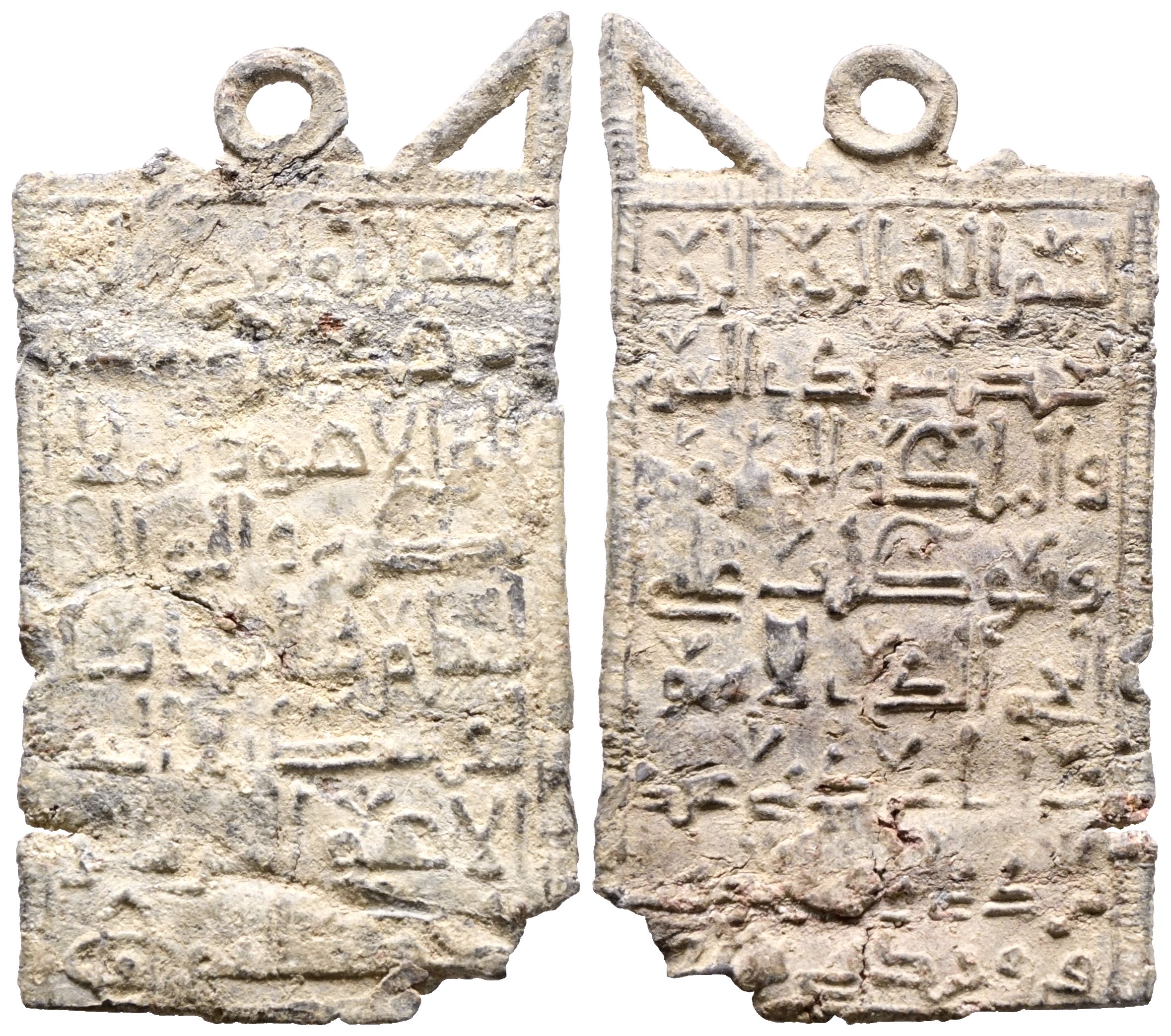 CALIPHAL OR LATER PERIOD. Rectangular amulet. (Pb. 11.18g/50x28mm). Possibly 10th-12th century. (Amulets 55, Type A-III/IV). Rectangular lead plaque with signs of having been folded into a triptych shape and two fastening elements at the top. In both areas, there are Quranic texts divided into eight lines of elegant Kufic script, with floral ornaments on some of the final letters and the stems of the upper letters finished with a bevel. Anv: ...بسم الله الرحمن الر حيم / تحصّنت بذي العزّ / ة و الملك و الجبرو / و توكلت على / الحيّ الذي لا يموت (In the name of God, the Gracious, the Merciful! I fortify myself in him who has glory and majesty and omnipotence and I trust in the Living One who does not die...). Rev: ب سم ألله الرحمم الرحيم /...ـ. (In the name of God, the Gracious, the Merciful!...). Good Very Fine. Extraordinary specimen. Rare and much more so.