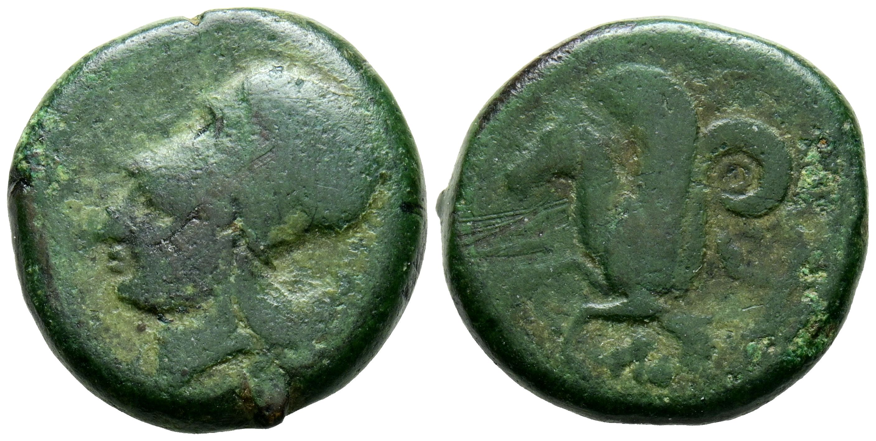 SICILY, Syracuse. Ae20. (Ae. 7.17g/20mm). 405-367 Fine (HGC 2, 1456). Obv: Head of Athena with helmet facing left, legend above: ΣYPA. Rev: Hippocampus facing left. VF-.