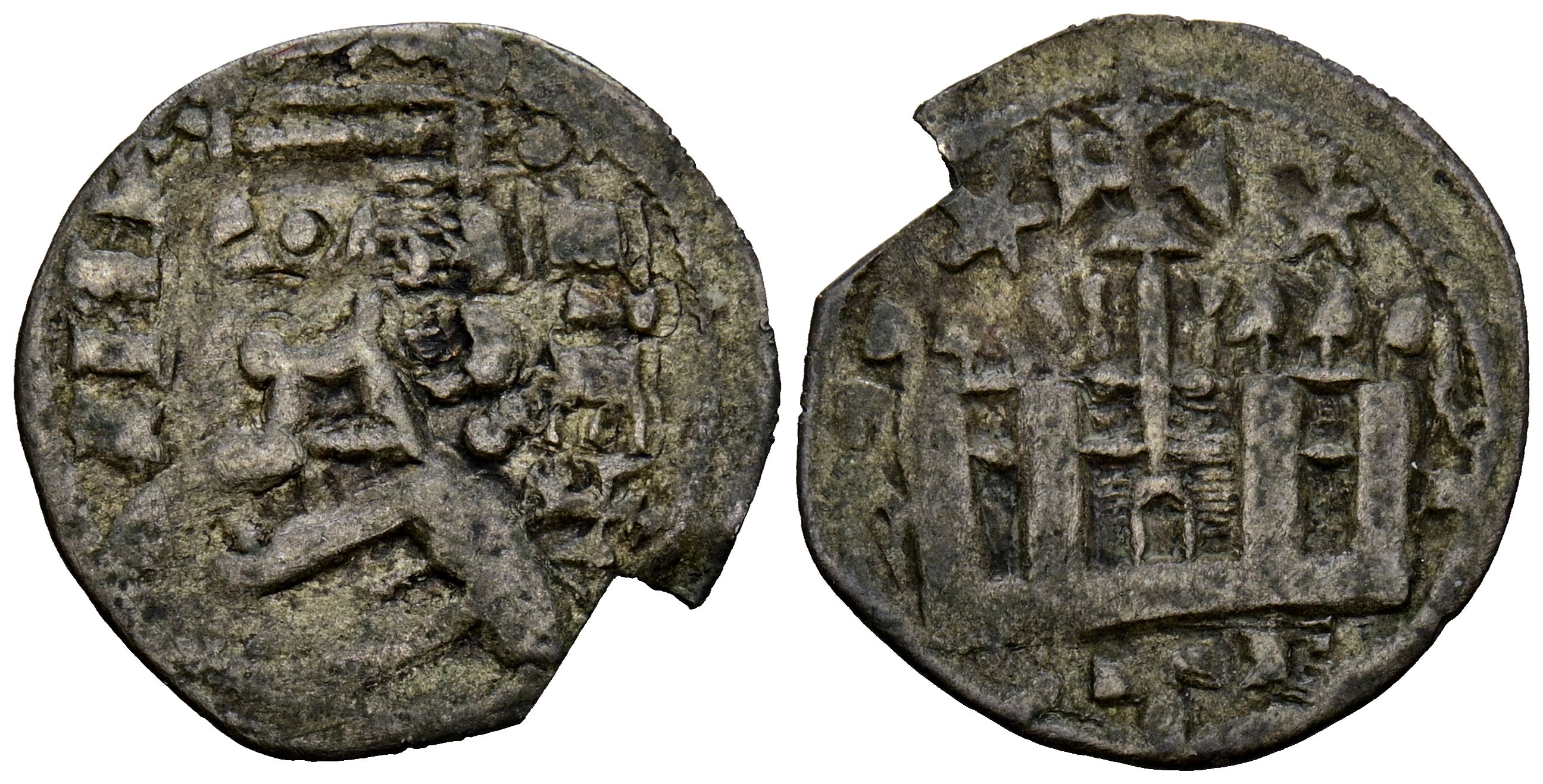 ALFONSO VIII (1158-1214). Coin. (Ve. 0.85g/18mm). Possibly Toledo. (Imperatrix A8:36.26; FAB-205). Obv: Crowned bust of Alfonso VIII facing left, surrounding legend: ANFVS REX. Rev: Castle with a decorated central cross, crescent on the left, star on the right, surrounding legend: CASTELE. VF. Missing on one blank.