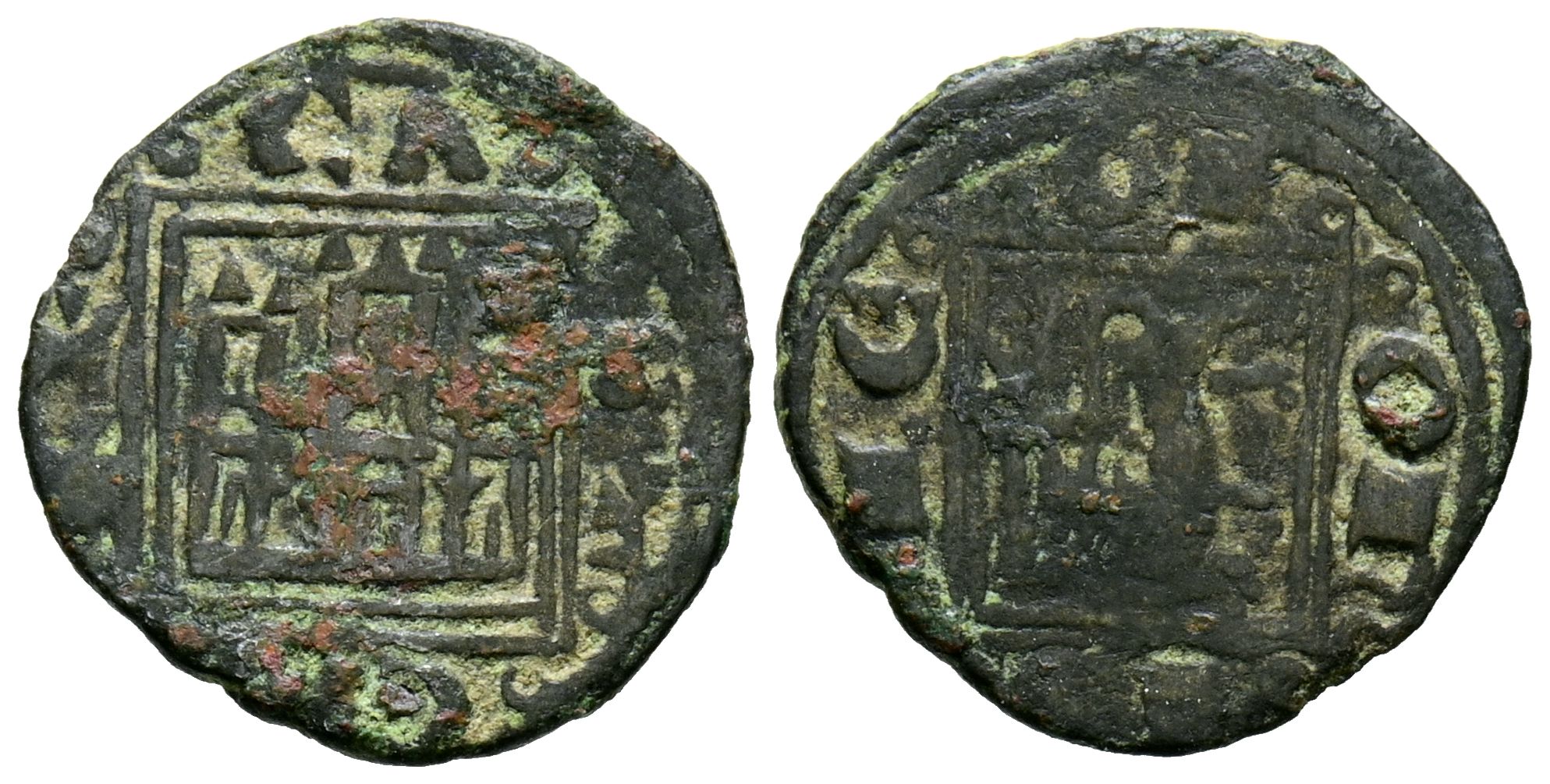 Alfonso X (1252-1284). Pugesa / Obolo. (Ve. 0.75g/14mm). Burgos. (Imperatrix A10:14.14; FAB-281). Obv: Castle with B above the right tower within a square beading, around the legend: CASTELLE. Rev: Lion passant to the left within a square beading, around the legend: LEGIONIS. VF-.