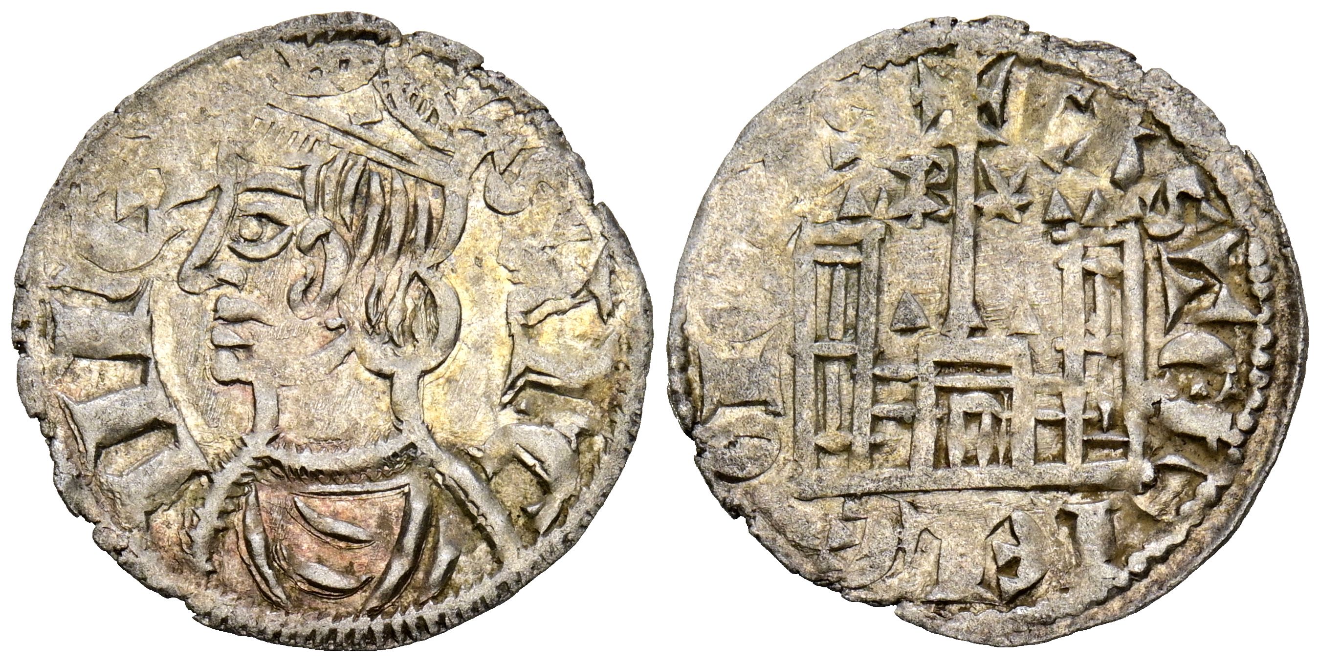 SANCHO IV (1284-1295). Gored. (Ve. 0.86g/19mm). Burgos. (Imperatrix S4:3.1; FAB-296). Obv: Crowned bust of Sancho IV facing left, surrounding legend: SANCII REX. Rev: Castle with cross on a central stem between B and a star, surrounding legend: CASTELLE E LEGIONIS. VF+. Minting gap. Light toning.