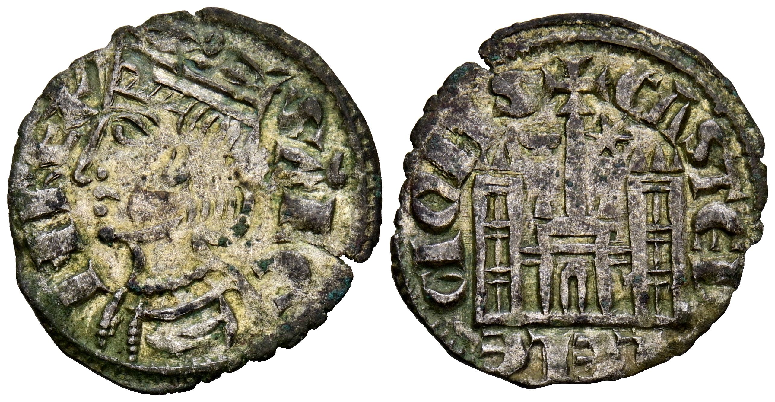 SANCHO IV (1284-1295). Gored. (Ve. 0.84g/19mm). Basin. (Imperatrix S4:3.12; FAB-298). Obv: Crowned bust of Sancho IV facing left, surrounding legend: SANCII REX. Rev: Castle with cross on a central stem between a bowl and a star, surrounding legend: CASTELLE E LEGIONIS. VF+.