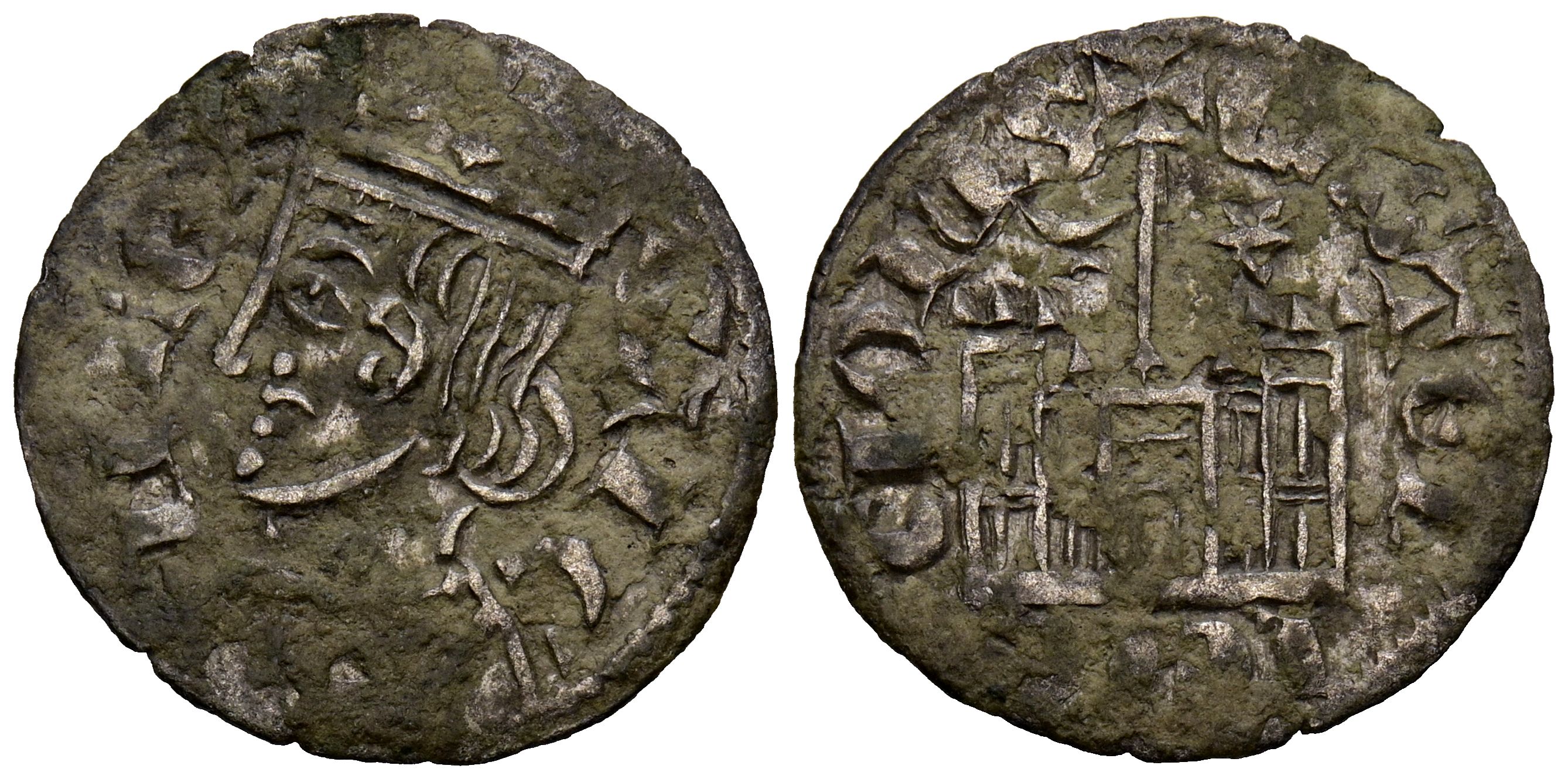 SANCHO IV (1284-1295). Gored. (Ve. 0.80g/18mm). Basin. (Imperatrix S4:3.12; FAB-298). Obverse: Crowned bust facing left, surrounding legend: SANCII REX. Rev: Castle with cross on a central stem, bowl and star on the sides, surrounding legend: CASTELLE E LEGIONIS. VF+.