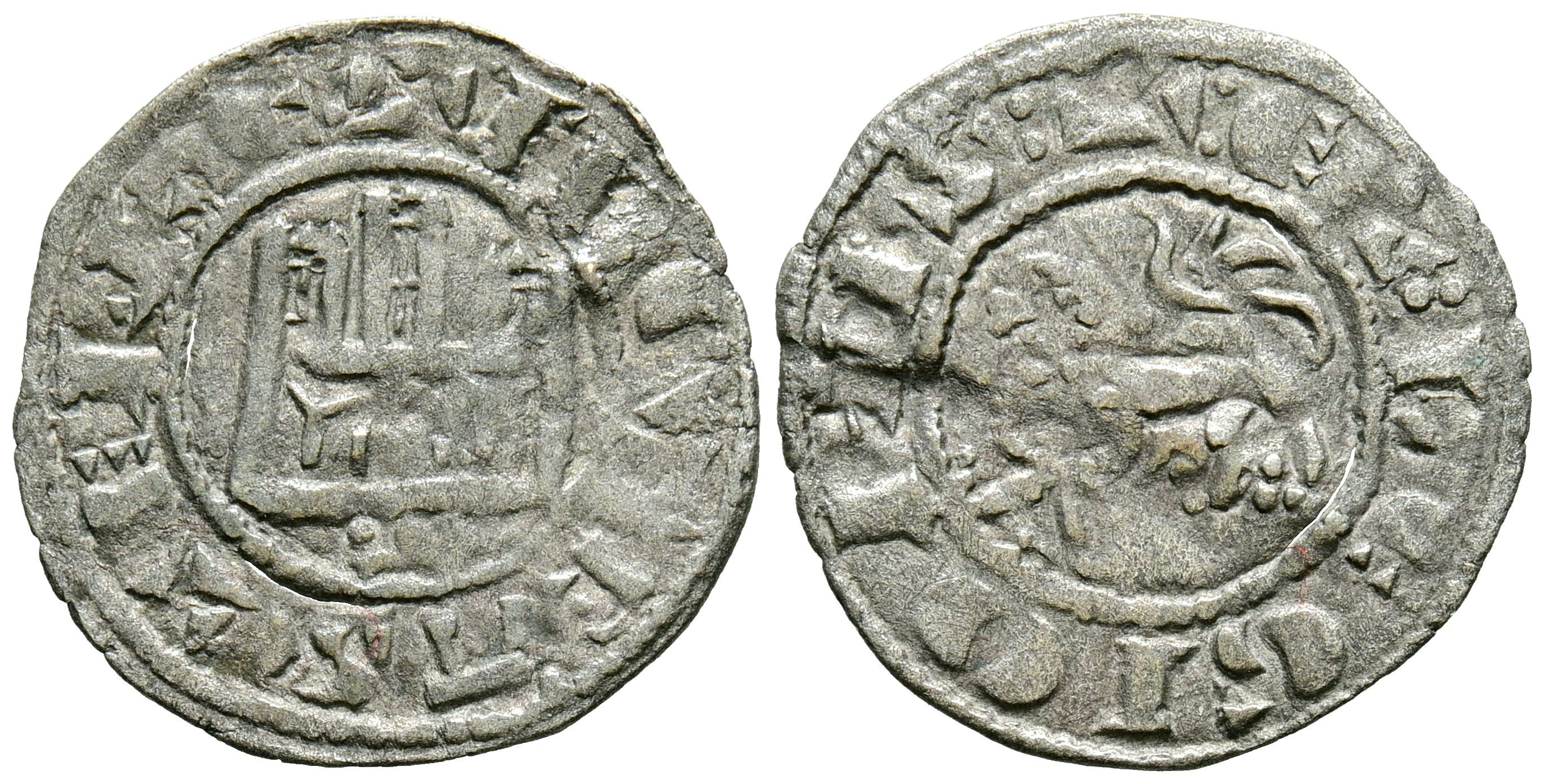 FERDINAND IV (1295-1312). Coin. (Ve. 0.68g/19mm). Three-point mintmark. (Imperatrix F4:2.46; FAB-328, as pepión). Obv: Castle, with three points below, all within a circular beading, around the legend: F REX CASTELLE. Rev: Lion rampant to the left within a circular beading, around the legend: ET LEGIONIS. VF+.
