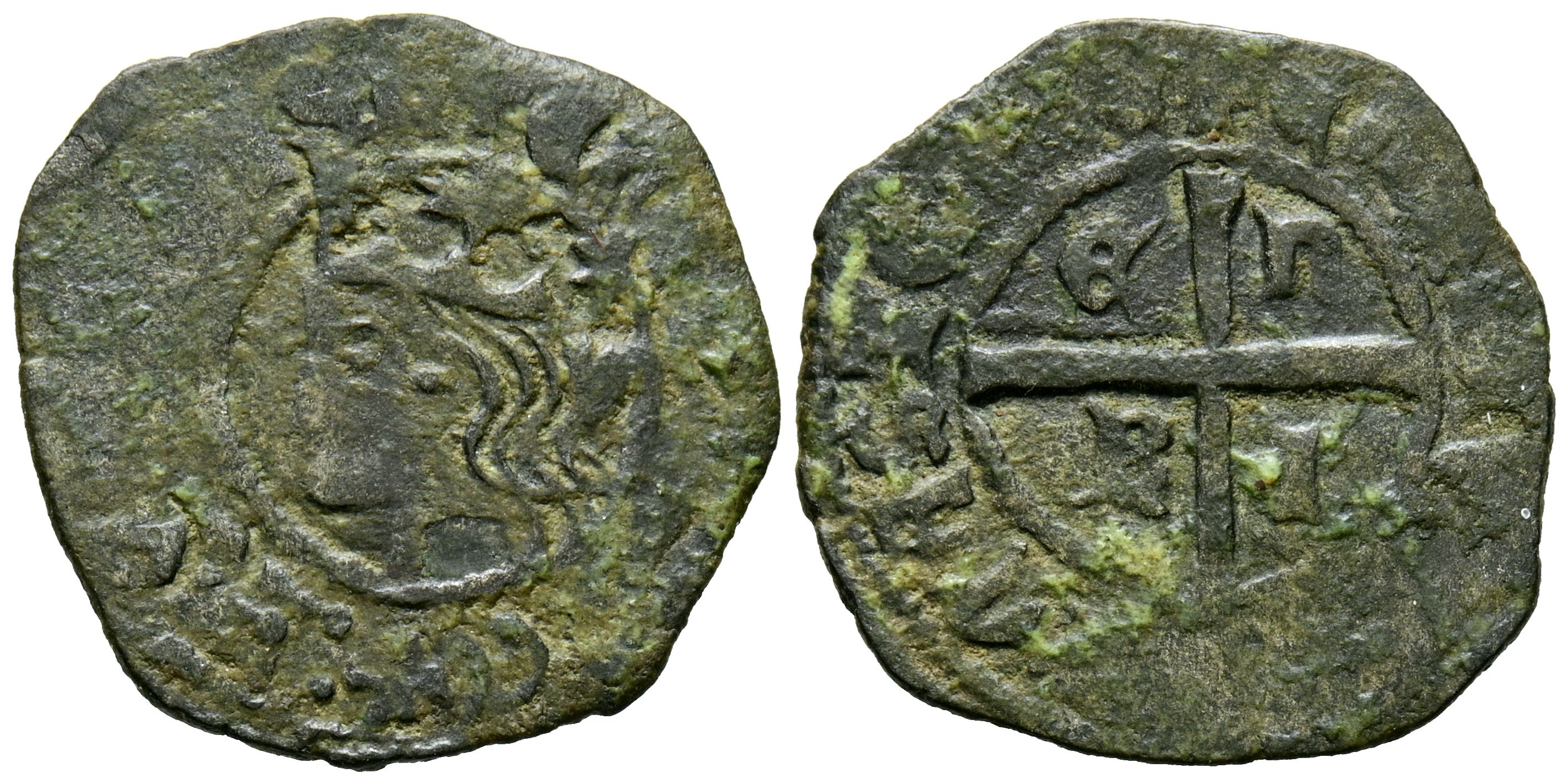 HENRY II (1368-1379). Crusader. (Ve. 1.85g/21mm). Valencia de Alcántara or Valladolid. (Imperatrix E2:11.70; FAB-476, like Villalón). Obv: Crowned head of Henry II facing left, with a V behind, all within a circular beadwork, with the legend around it: ENRICVS REX LEGIONIS. Rev: Latin cross breaking a beadwork, in the ENRI quarters, and the legend around it: ENRICVS REX CASTELLE. VF-. Scarce.